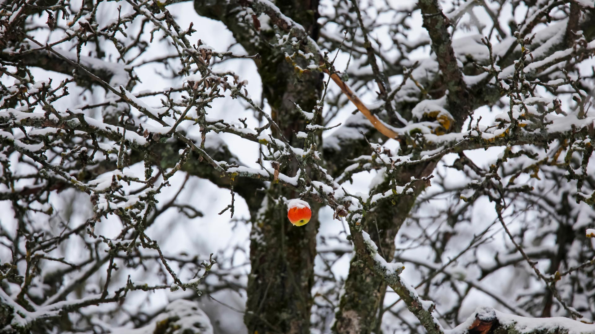 Apfel hängt an einem verschneiten Baum, Deutschland (© Westend61/Getty Images)