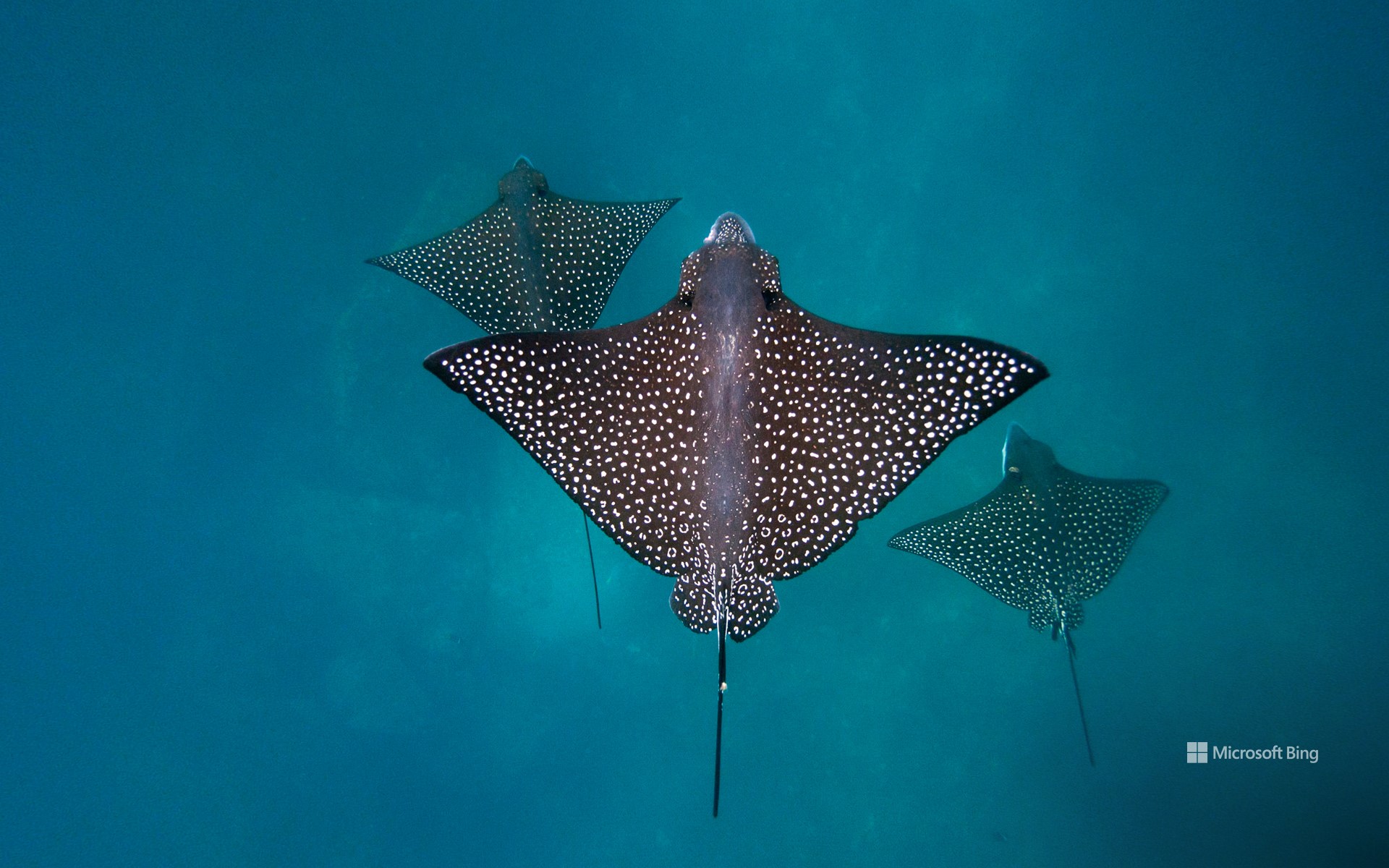 Auf dem heutigen Bild sehen wir Gefleckte Adlerrochen vor der Insel San Cristóbal auf den Galapagosinseln in Ecuador. Diese majestätischen Tiere zeichnen sich durch ihren rautenförmigen Körper, ihren langen, dünnen Schwanz mit giftigen Stacheln und das charakteristische Muster aus weißen Flecken auf dunklem Grund aus. Sie schwimmen mit eleganten Bewegungen ihrer Brustflossen, die an das Flattern eines Vogels erinnern, was ihnen ein fast ätherisches Aussehen verleiht, während sie durch das kristallklare Wasser der Galápagos gleiten.