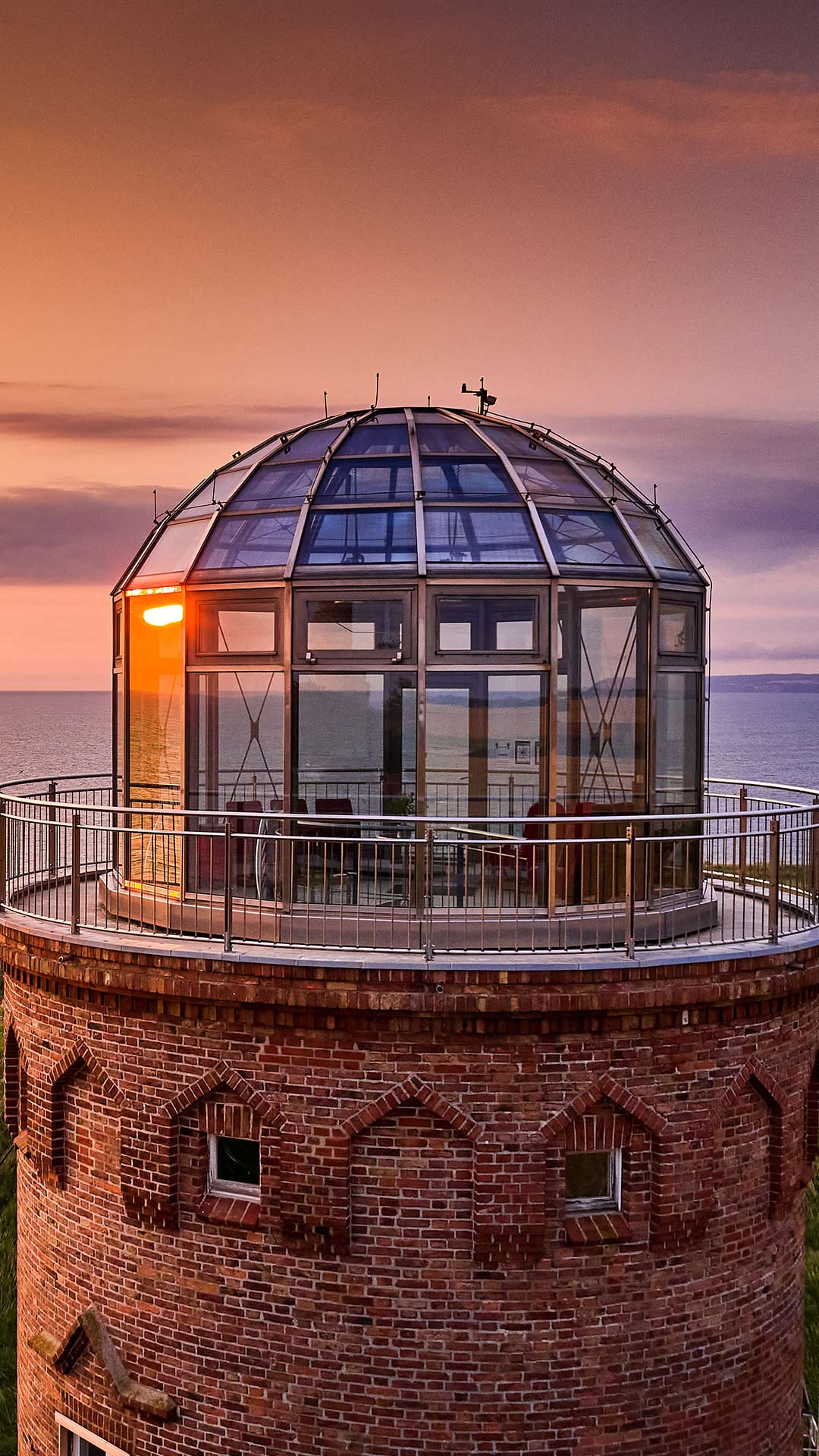 Über der Nordspitze Rügens liegt am Kap Arkona warmes Abendlicht über Backstein und Glas. Der Peilturm mit seiner markanten Kuppel erhebt sich über die sanft geschwungenen Klippen und fängt die letzten Farben des Himmels ein. Unter ihm fällt die Steilküste bis zu rund 43 Meter zur Ostsee ab, die sich ruhig bis zum Horizont erstreckt.