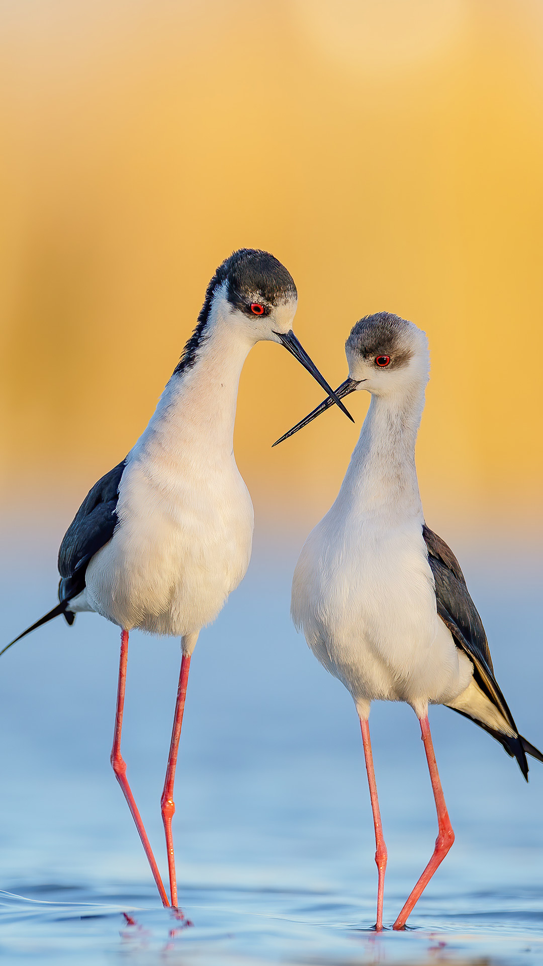 Across the shimmering lagoons of Africa, the winding deltas of Asia and the salt marshes of southern Europe, a graceful figure emerges, poised delicately between water and sky. The black-winged stilt, with its long, slender red legs, moves with quiet elegance through the shallows. Their presence sometimes evokes a quiet intimacy—two birds drifting close, their movements mirroring one another in a delicate choreography, as if sharing a secret only the wetlands can hear. They hunt with quiet precision, gently picking insects, larvae and tiny crustaceans from the water's surface. Each movement reveals a subtle mastery of their environment, shaped by patience and instinct.