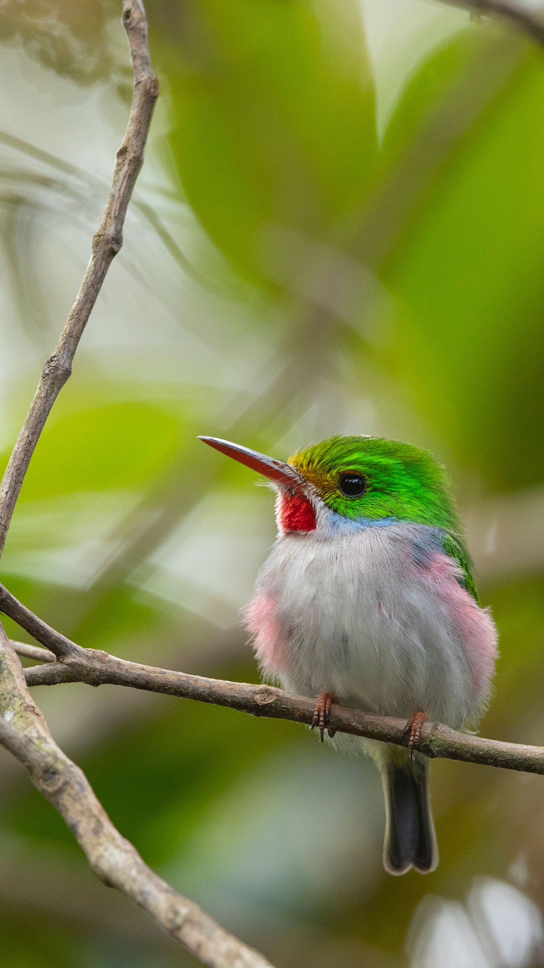 The tiny, colourful Cuban tody can only be found in Cuba and its neighbouring islands. Its vibrant outfit gives it a unique look: sparkling green back, pale grey underparts, a red throat, pink flanks, blue ear patches and a black and red beak. Despite their colourful plumage, their size makes them hard to see; however, they are easy to hear. The soft sound of 'pprreeee-pprreeee' or a short 'tot-tot-tot-tot' will tell you there's a tody somewhere nearby.