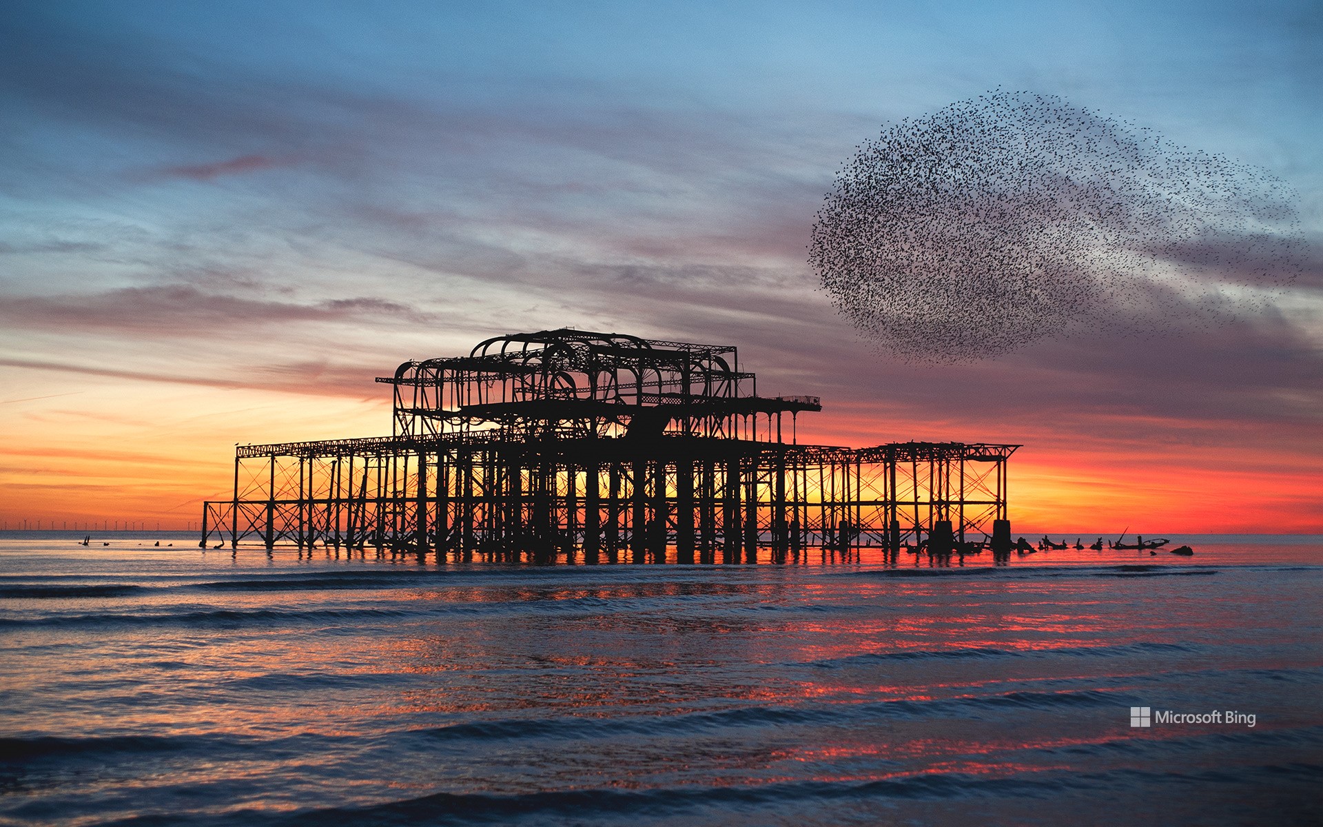 Starling murmuration over the ruins of Brighton's West Pier, England