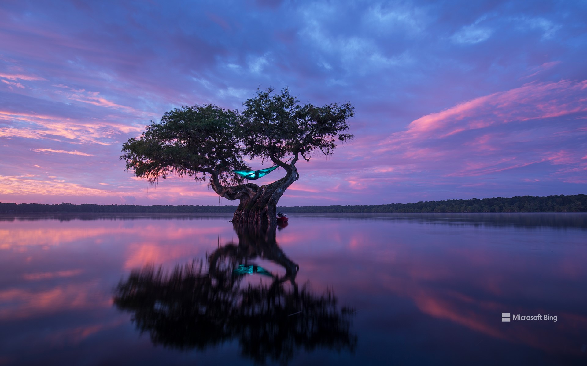 Hammock camping is what's up. Pictured here is a hammock tied between two branches of a huge bald cypress tree under a pink sky in Florida, United States. The traditional hammock was originally developed by native inhabitants of the Americas to protect themselves from dangerous insects and animals while sleeping. Today hammocks are used to enhance many recreational experiences—they are a traveller's best buddy—and are made from a variety of materials like fabric, netting or rope. What's a great location for some hammock time? Places like Cumbria, Norfolk and Somerset offer hammock-friendly campsites. Have hammock, will travel, and relax. It's just that simple.