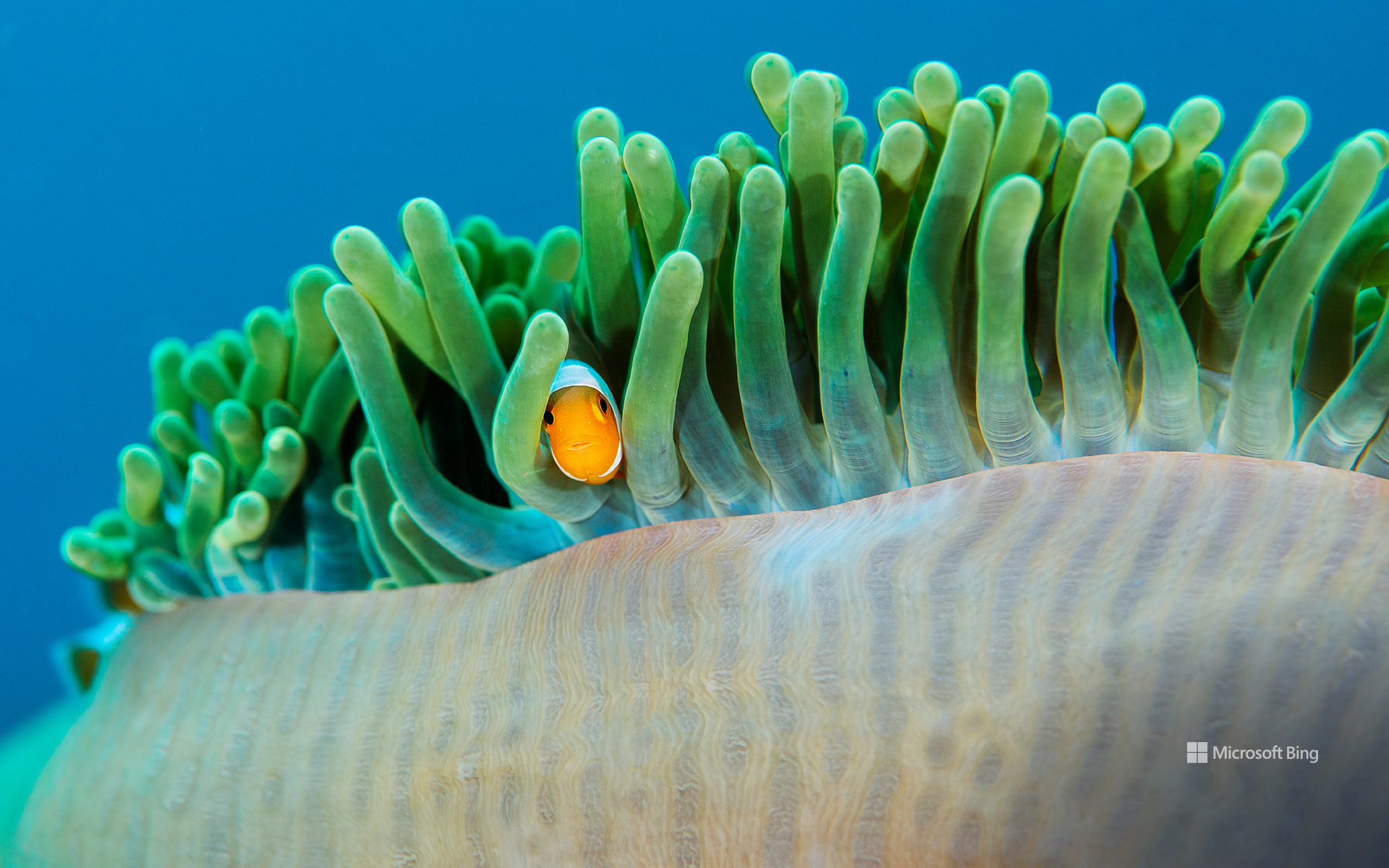 In the image, a common clownfish peeks out from its sea anemone home in Indonesia's Raja Ampat Islands, a remote archipelago at the heart of the Coral Triangle, known for extraordinary marine diversity. The clownfish's special mucus coating protects it from harm, allowing it to shelter safely among the tentacles. In return, the fish helps deter predators and drops food scraps the anemone can eat.