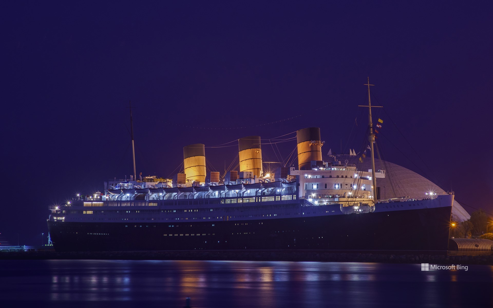 Night view of the RMS Queen Mary, Long Beach, California, United States
