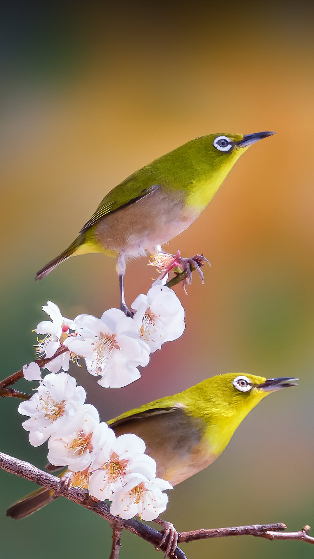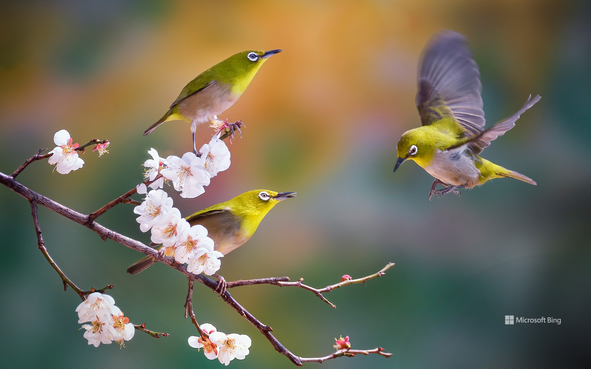 Yellow, round, tiny, and gregarious—say hello to these silvereyes enjoying cherry blossoms in South Korea. While this family of passerine birds is native to Africa, Australasia, and Asia, several of its species can be found in places like French Polynesia and Hawaii, where they appeared by introduction. Also known as white-eyes or wax-eyes, these birds come in a range of colors and patterns, but they all share that trademark eye ring. They have a sweet tooth for nectar, but they're not picky eaters, happily feeding on fruits, insects, and berries. Let's celebrate these beauties for adding a touch of wonder to spring!
