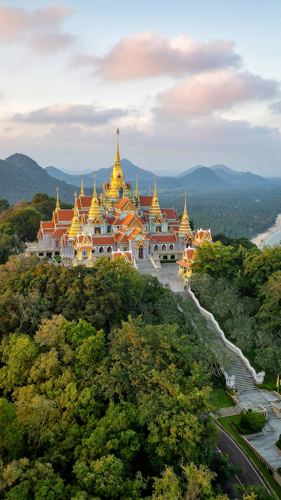 Those seeking a calmer way to celebrate might consider visiting Wat Tang Sai Temple in the village of Ban Krut, seen in today's image. Perched on Thong Chai Mountain, this temple complex is home to a 43-foot-tall Buddha statue and Thai-style pagodas. Built in 1996 to honor King Bhumibol Adulyadej (Rama IX) on his 50th year of reign, it remains an important spiritual site. With stunning coastline views, Wat Tang Sai offers a peaceful setting to meditate and feel the vibrations of Buddhist chants.