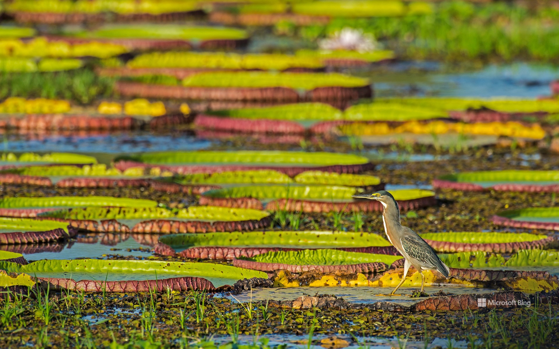 Striated heron on a Victoria water lily, Pantanal, Brazil