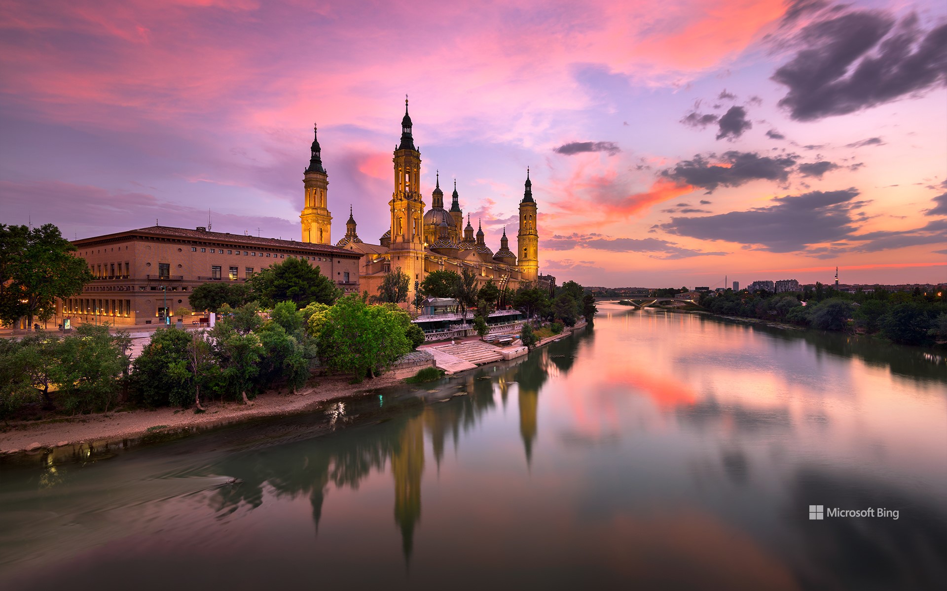 La gran oferta cultural y gastronómica de la zona hacen de esta celebración y de la ciudad un lugar único para visitar en estos días. Eso sí, si pasas por allí, no dudes en probar sus platos típicos como el Ternasco de Aragón, las migas o el lomo a la zaragozana. Puedes culminar el día dando un paseo por la orilla del río Ebro al atardecer, que alumbra esta espectacular vista hacia Catedral-basílica de Nuestra Señora del Pilar, y que vemos en la imagen de hoy.