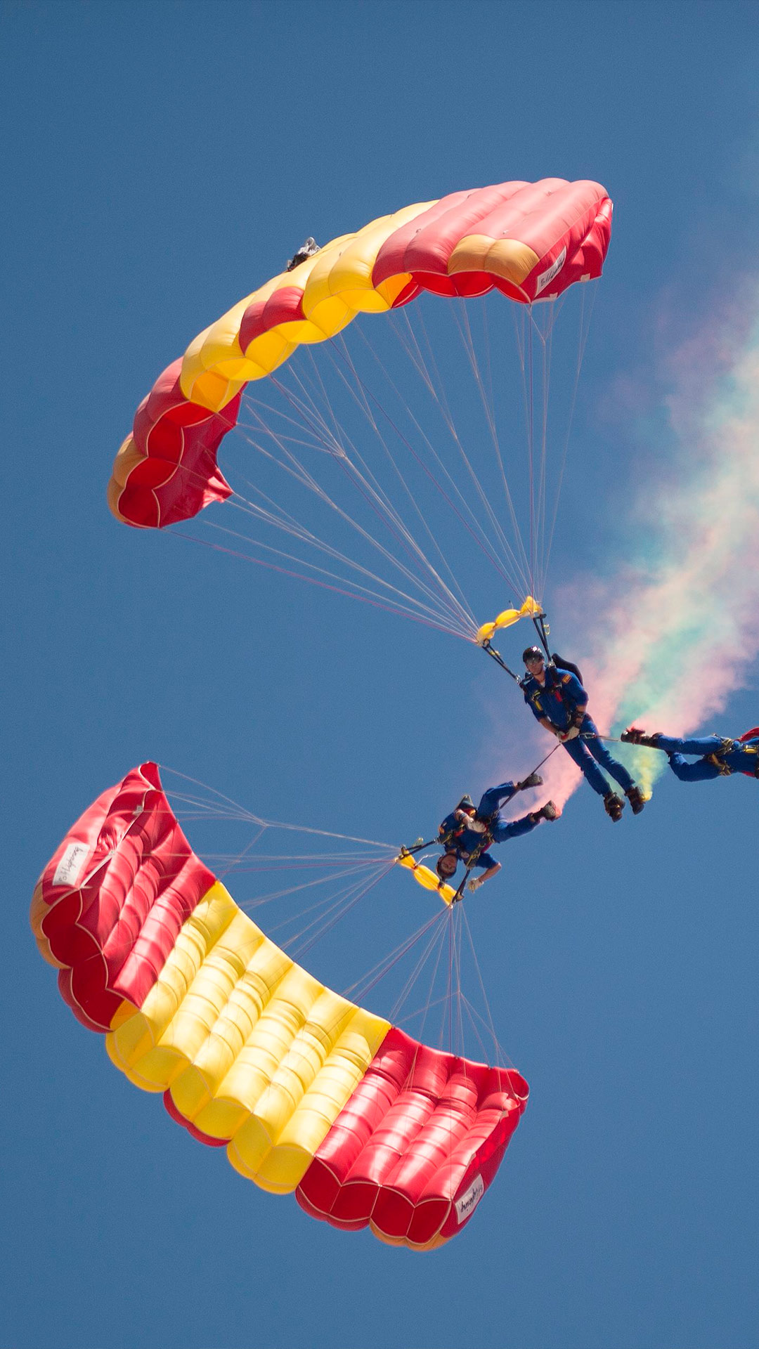 En diversos puntos de nuestro país se realizan actos conmemorativos, entre ellos desfiles y exhibiciones militares como la que vemos en nuestra imagen de hoy, donde podemos disfrutar de la Patrulla Acrobática Paracaidista del Ejército del Aire, a estos eventos asisten las autoridades del país, destacando las figuras de la Casa Real, el presidente del Gobierno y altos cargos del Estado.
