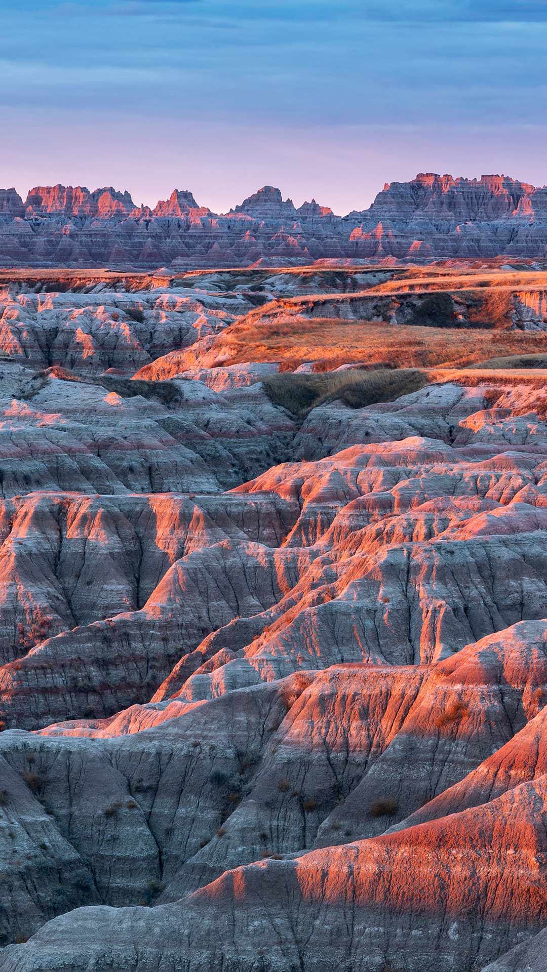 Esta imagen de densas capas no es un error de tu pantalla, sino las fascinantes gradas de yacimientos fósiles del Parque Nacional de Badlands, en Dakota del Sur, Estados Unidos. Bajo el revestimiento multicolor se esconde la historia de la tierra, que conserva restos de antiguos caballos, camellos, tigres y rinocerontes. El árido paisaje, decorado con cumbres y praderas, se formó principalmente por dos fuerzas contrarias de la naturaleza: la deposición (el proceso por el que pequeñas rocas se desplazan y se depositan en nuevos lugares) y la erosión (el proceso por el que las rocas se desgastan).