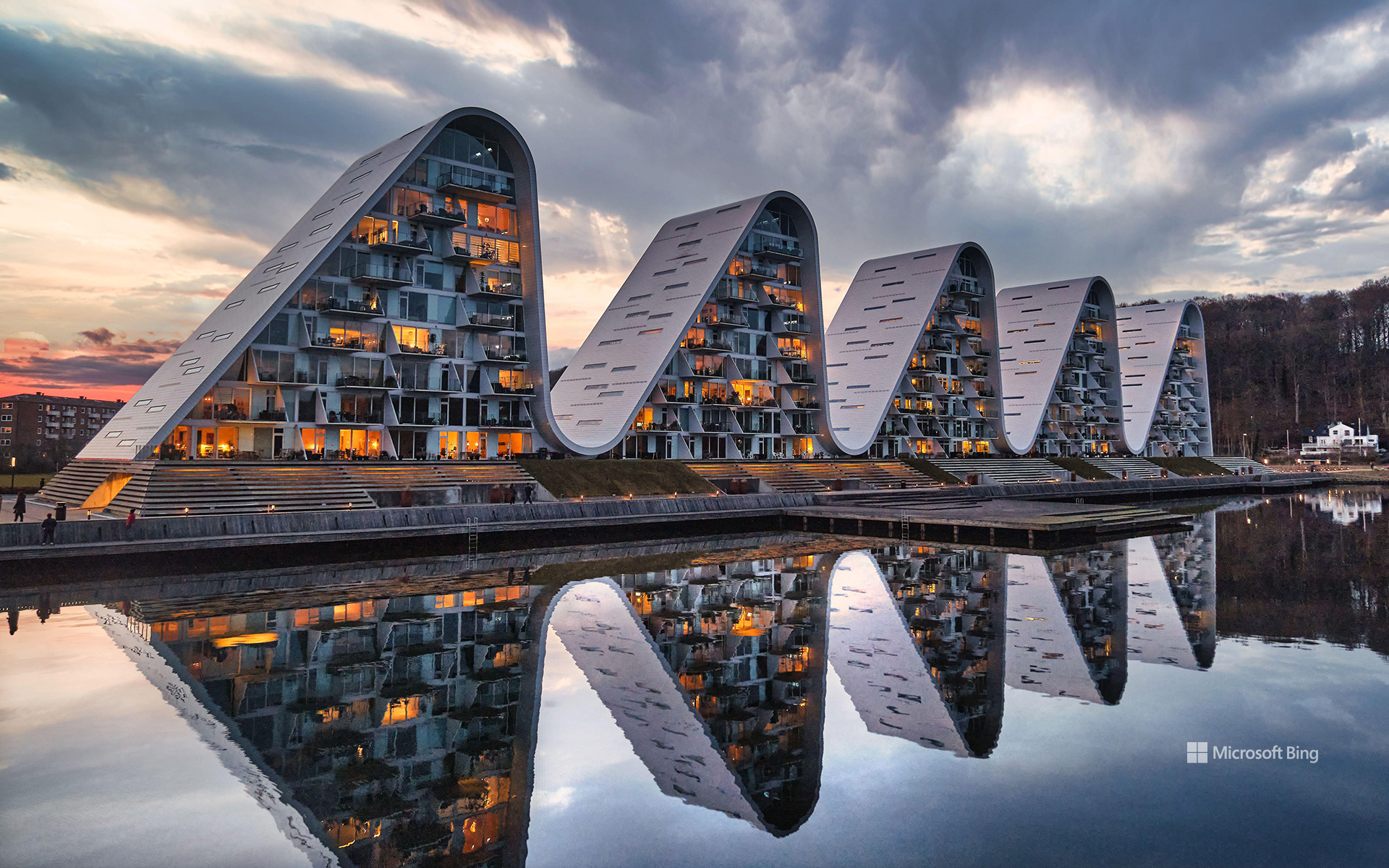 El complejo residencial The Wave, en Vejle (Dinamarca), destaca por su silueta ondulante formada por cinco crestas que evocan el movimiento del fiordo y las colinas que rodean la ciudad. Su diseño es obra de Henning Larsen Architects y se ha convertido en un icono de la arquitectura danesa contemporánea. El conjunto alberga cien apartamentos distribuidos en nueve plantas y su perfil se reconoce desde distintos puntos de la bahía gracias a la contundencia de su forma escultórica.