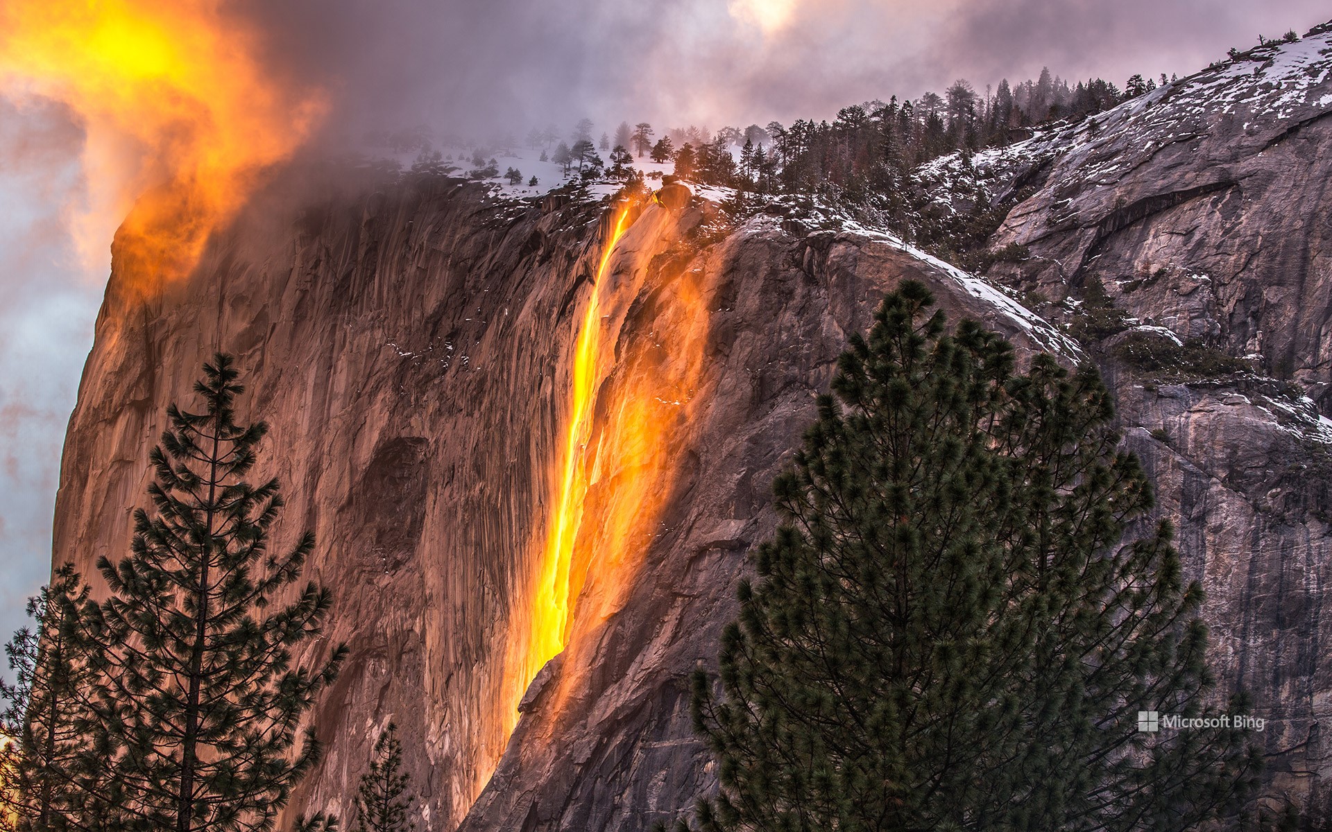 Connaissez-vous ce spectacle naturel unique du parc américain de Yosemite ? Horsetail Fall est une cascade saisonnière qui coule en hiver et au début du printemps. Pour avoir la chance d’observer ce phénomène étonnant, il faut que la neige soit abondante et que la température soit assez élevée. Pendant quelques semaines en février, sous un ciel dégagé, avec un débit d'eau suffisant et un soleil bien positionné, la cascade mince et élancée se pare de teintes flamboyantes, créant une véritable cascade de feu. Des centaines de spectateurs se rassemblent dans la vallée de Yosemite pour admirer ce spectacle hypnotique, parfois au point de rendre difficile de trouver un bon emplacement pour l'observation. Ce phénomène est baptisé « chute de feu » en référence à une cascade de feu historique créée par l'homme dans le parc de 1872 à 1968, où des braises étaient déversées d'une falaise. Les gardes du parc ont finalement décidé que cette pratique n'était pas la meilleure idée qui soit !