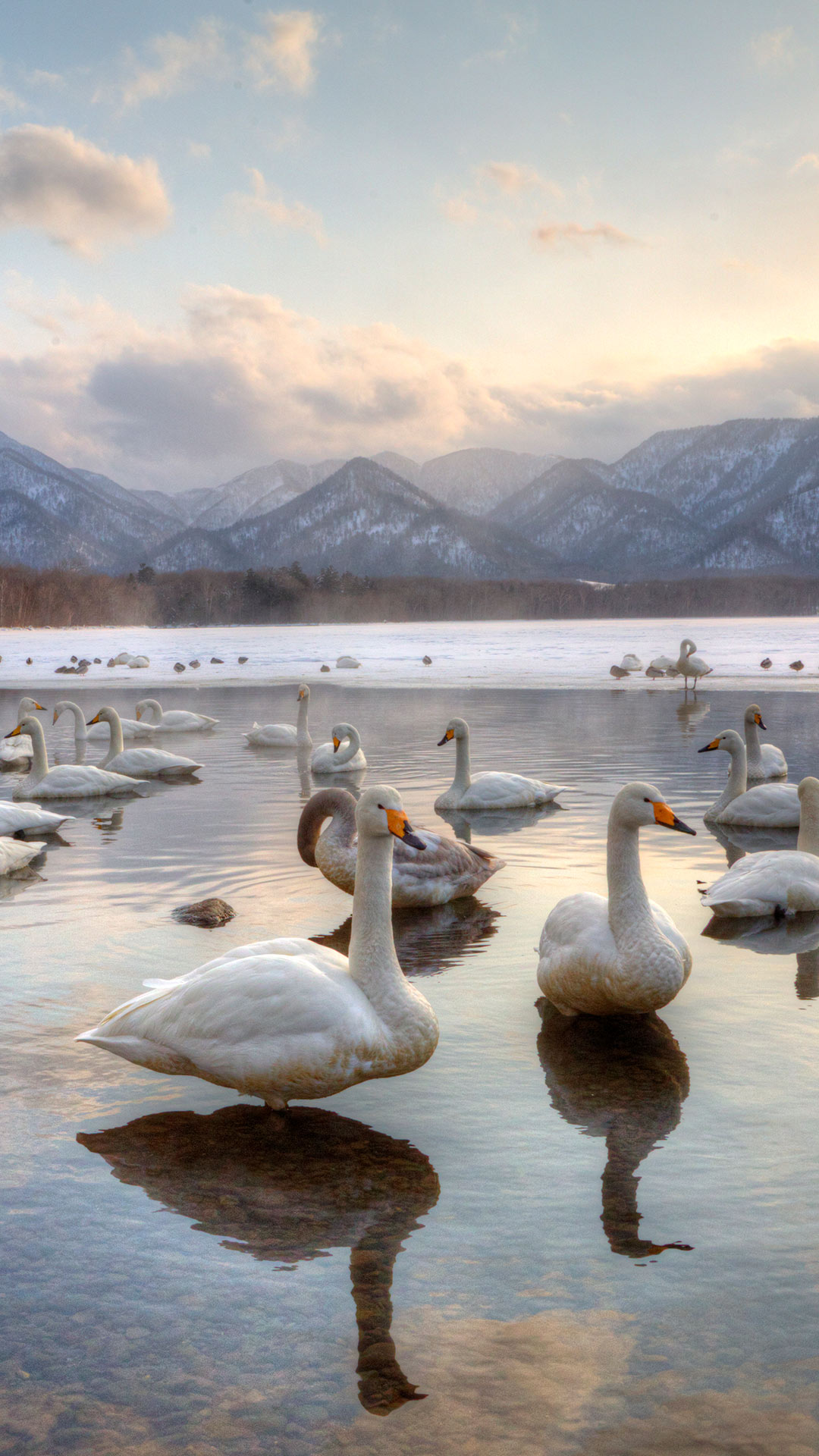 Caratterizzato da un piumaggio bianco candido, un collo lungo e sinuoso e un'apertura alare imponente, il cigno selvatico ha un'apertura alare che varia dai 2 ai quasi 3 metri, rendendolo uno degli uccelli più pesanti al mondo in grado di volare. È inoltre una delle poche specie monogame, capace di stabilire relazioni con il partner che possono durare per tutta la vita. Il lago Kussharo, situato nella suggestiva regione di Hokkaido in Giappone, è la dimora di una affascinante popolazione di queste splendide creature, che aggiungono un tocco di grazia e romanticismo a questo paesaggio suggestivo.