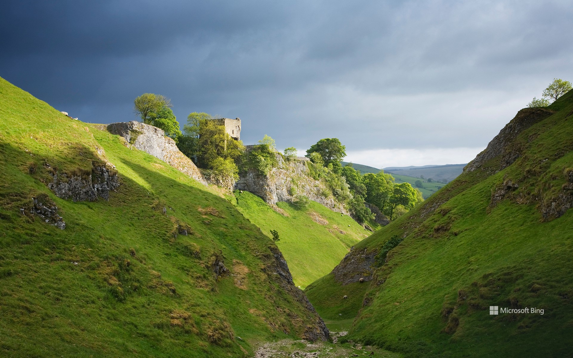 Cave Dale e il castello di Peveril, Derbyshire, Inghilterra