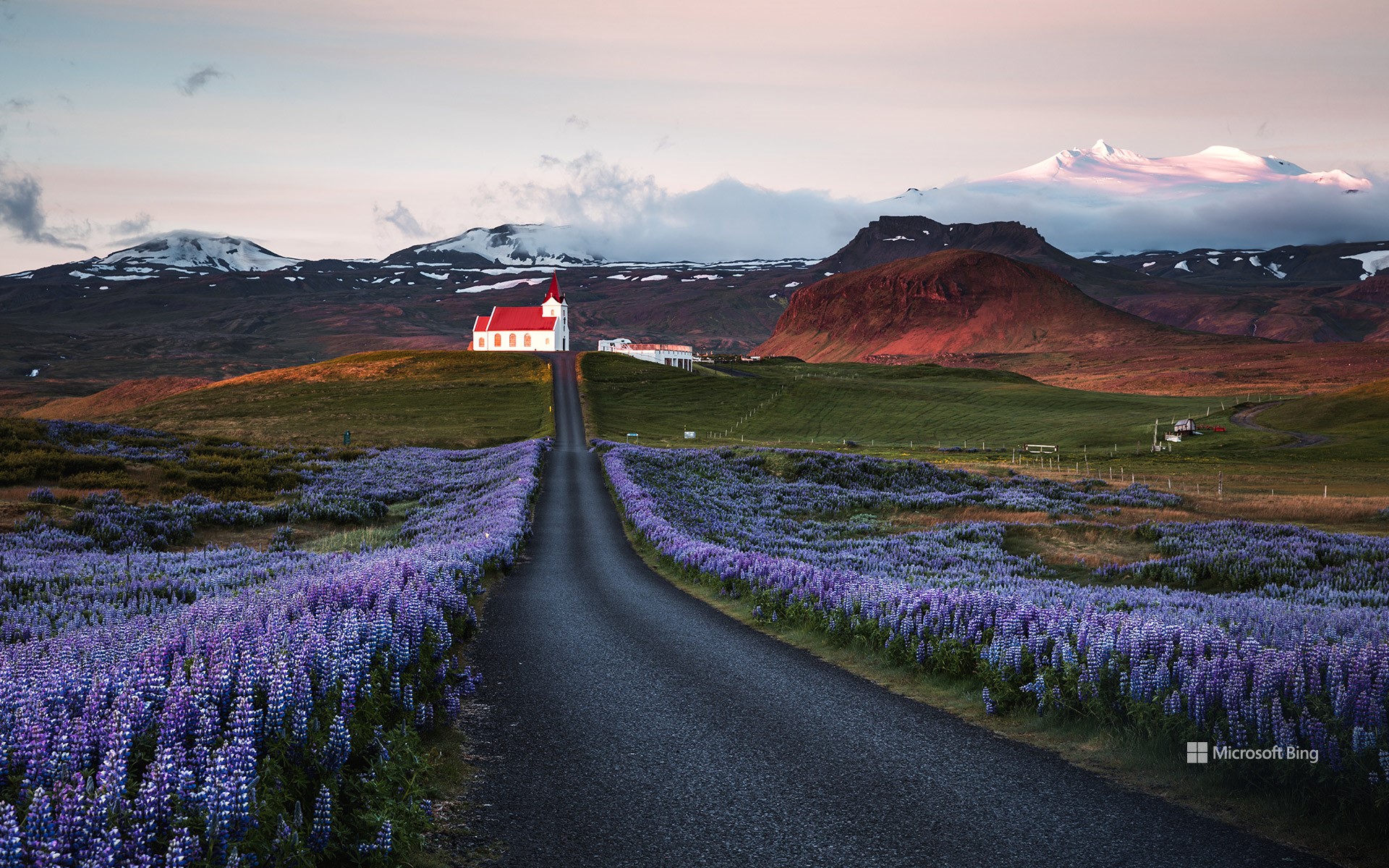 Campi di lupini e una chiesa all'alba, penisola di Snæfellsnes, Islanda (© Matteo Colombo/Getty Images)
