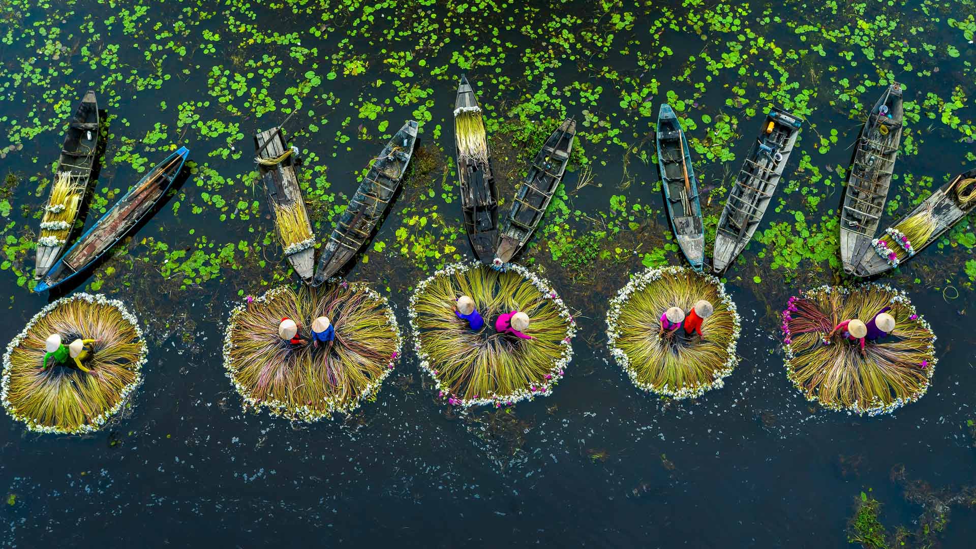 画像は、メコンデルタ地帯に位置するロンアン省の河川で睡蓮の栽培をしている人たち。メコン川の洪水がこの地域に栄養分をもたらし、睡蓮の花が豊かに咲き誇ります。睡蓮は、花からはお茶が作られ、そして茎は食用として利用され、地元経済に重要な役割を果たしています。