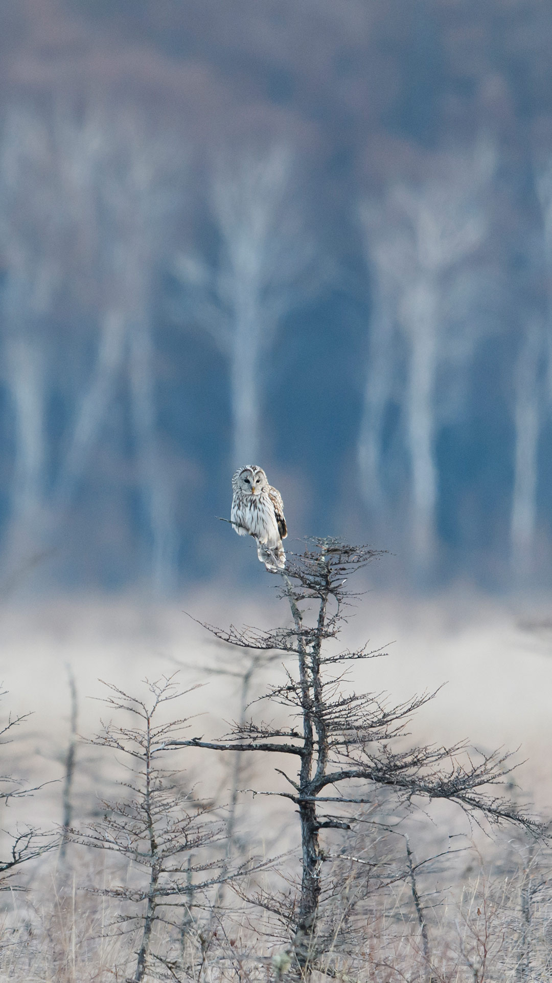 枝の先に止まっているフクロウ (© rockptarmigan/Getty Images)