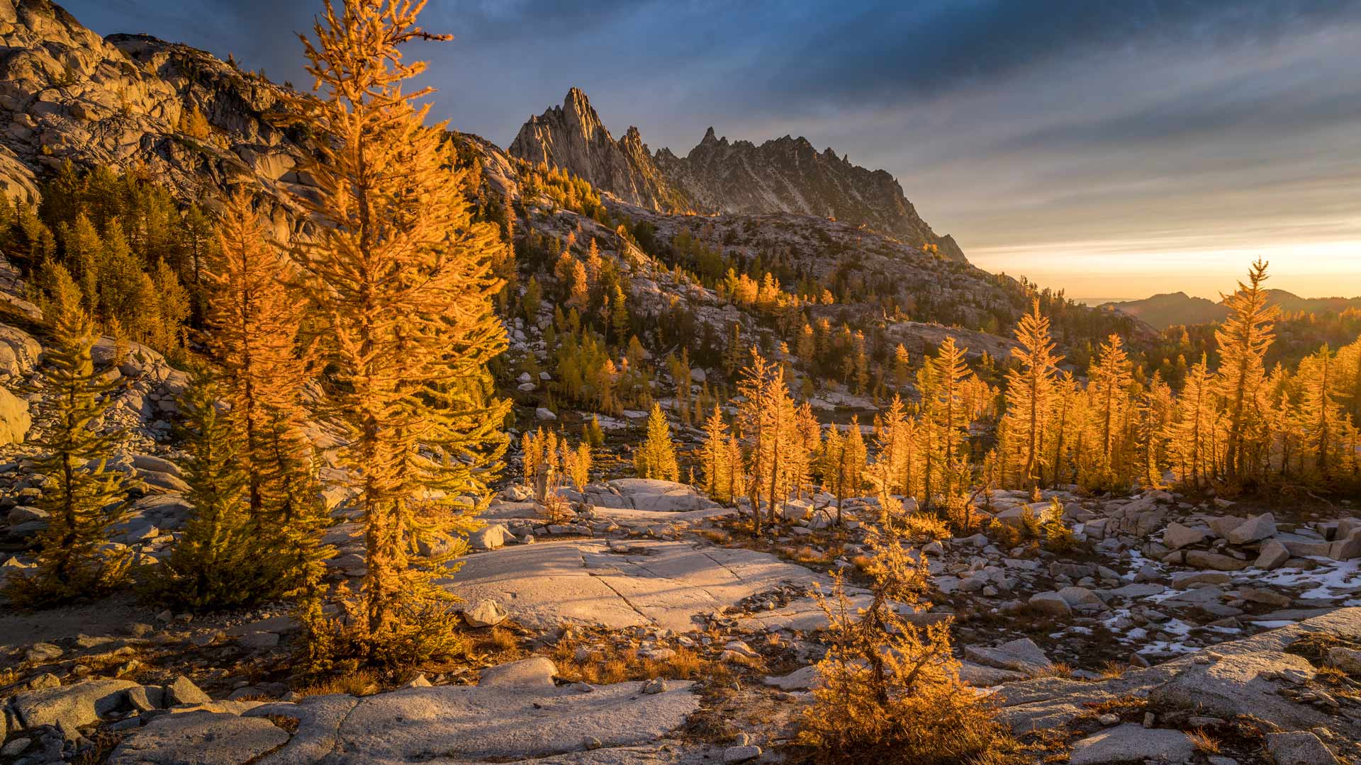 A região das Enchantments, no estado de Washington, ostenta mais de 700 lagos e lagoas alpinas. Muito antes da chegada dos colonos europeus, as Enchantments eram lar de tribos nativas americanas como os Yakima, Chinook e Wenatchi. Ondas de exploração madeireira e mineração no século XX transformaram grande parte da paisagem. Hoje, rebanhos de cabras-da-montanha pastam pelo parque, e lagópodes repousam nas árvores. A terra passa por transformações quando as agulhas das árvores pinheiro larício assumem um tom dourado, lançando um brilho quente no terreno rochoso.