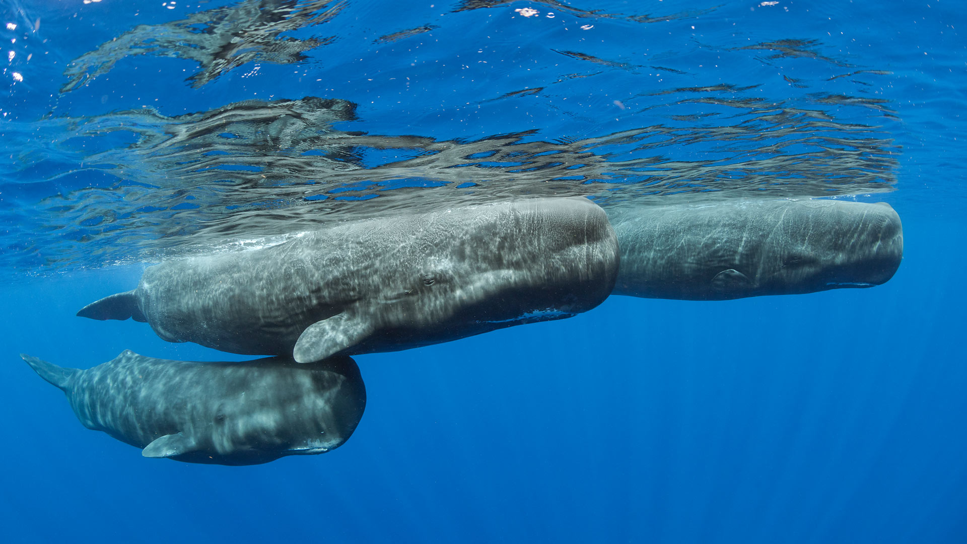 As 92 espécies de baleias do planeta estão divididas entre baleias-de-barbatana e baleias dentadas. As baleias-de-barbatana usam partes da boca semelhantes a cerdas para filtrar pequenos crustáceos da água. As cachalotes retratadas aqui, assim como as outras 76 espécies dentadas, usam dentes em forma de cone para atacar suas presas. Diferentemente das baleias-de-barbatana, elas caçam e navegam usando ecolocalização, um método que utiliza o som para detectar o que está ao seu redor.