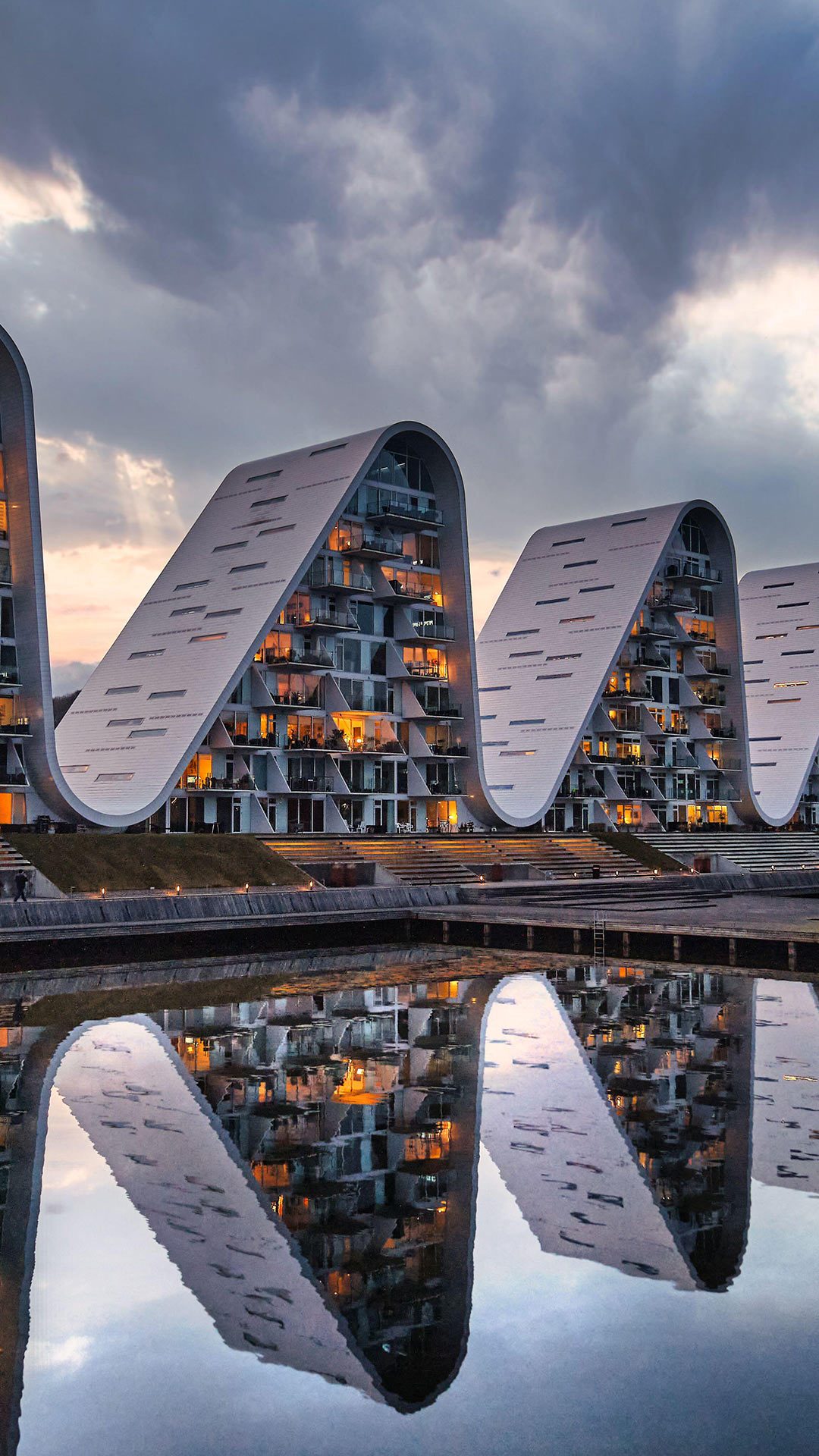 Arquitetura é cálculo, sim — mas também sabe ser espetáculo. Na imagem, o conjunto The Wave, em Vejle, na Dinamarca, é a prova viva: cinco torres residenciais ondulam à beira do fiorde como se o concreto tivesse aprendido a nadar. Nada de linhas retas previsíveis. Cada bloco sobe e desce em curvas contínuas, seguindo o desenho das colinas ao redor e o balanço das águas ao lado. Projetado pelo escritório Henning Larsen, o complexo vai além do impacto visual. Passarelas públicas, píer e áreas abertas costuram a orla à cidade, transformando moradia em espaço de convivência.