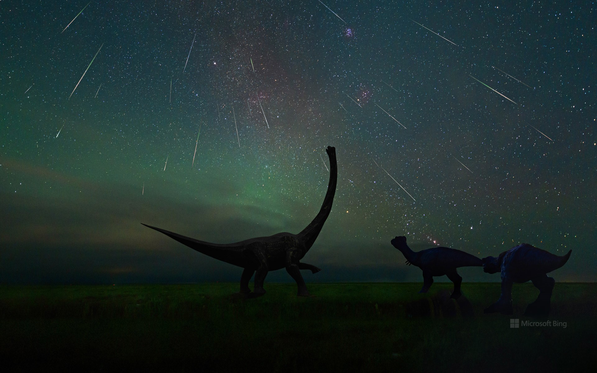 拍摄于二连浩特恐龙博物馆中的英仙座流星雨,中国内蒙古 (© bjdlzx/Getty Images)