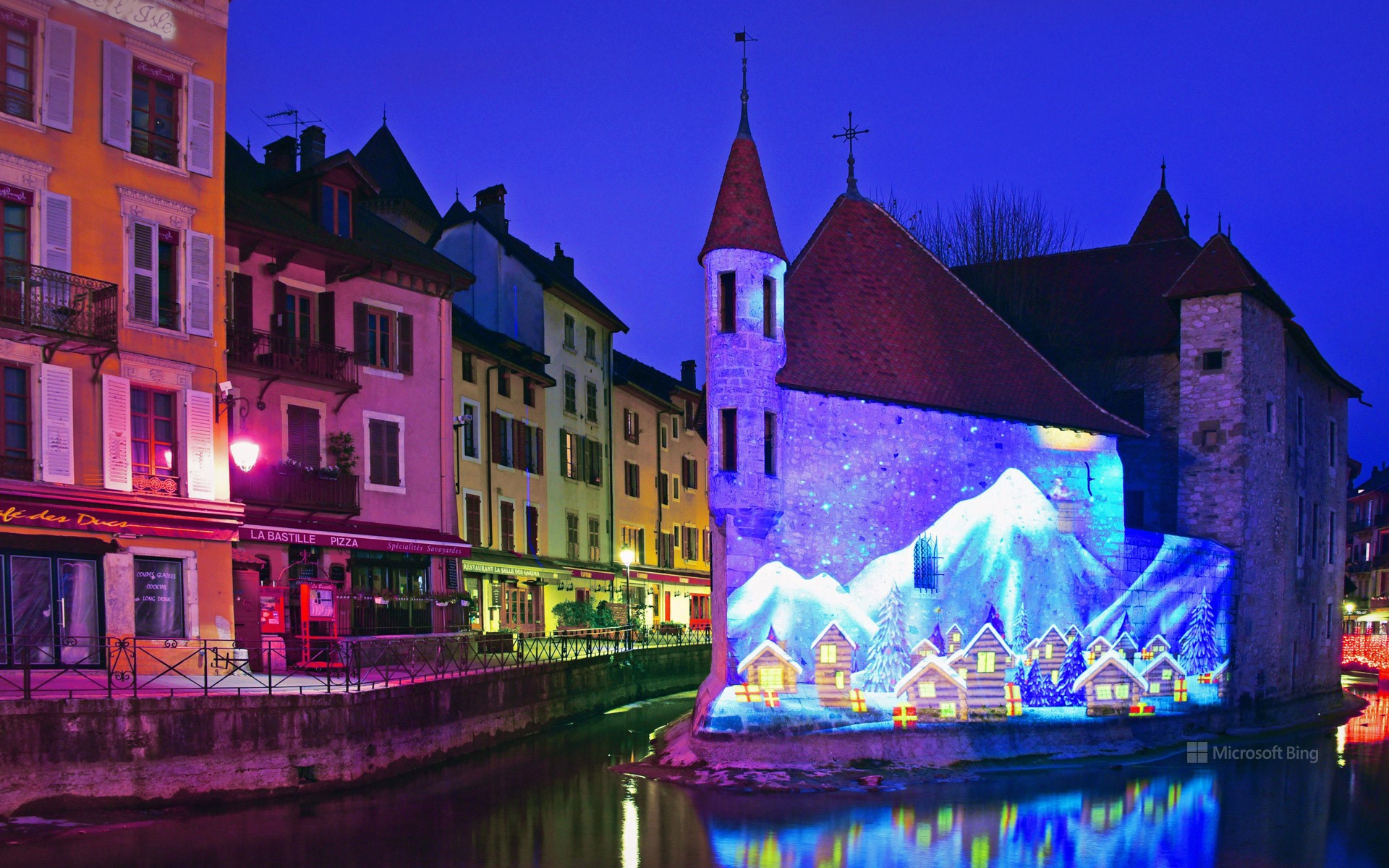 投射在安纳西中皇岛墙上的雪景影像,法国上萨瓦省