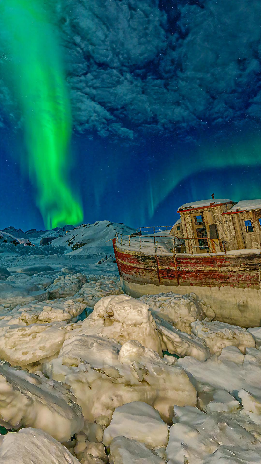 搁浅船只上空的极光,格陵兰岛塔西拉克