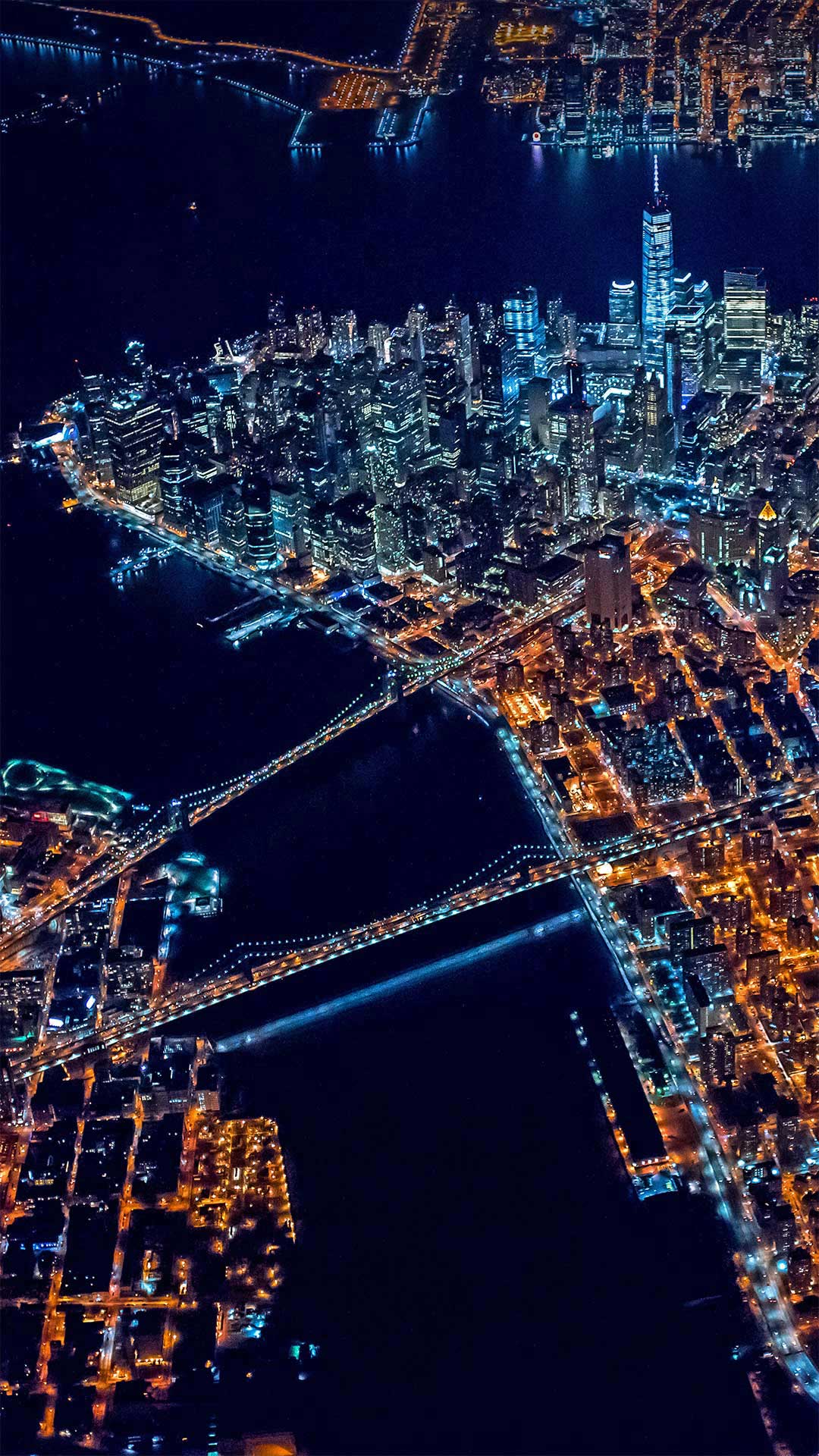今天我们俯瞰曼哈顿,纽约的五个行政区之一。这张鸟瞰图是曼哈顿下城,纽约人认为这里是城市的中心。那是远处哈德逊河对岸闪闪发光的新泽西州。左图中的两座桥分别是布鲁克林桥(上)和曼哈顿桥(下),连接着曼哈岛和布鲁克林区。你可以在城市的几个地方,包括帝国大厦、洛克菲勒中心和世界贸易中心一号楼的观景台,从空中欣赏这些耀眼的夜景。