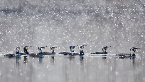 在暴风雪中畅游的鸬鹚,德国黑森州 (© Wilfried Martin/Getty Images)