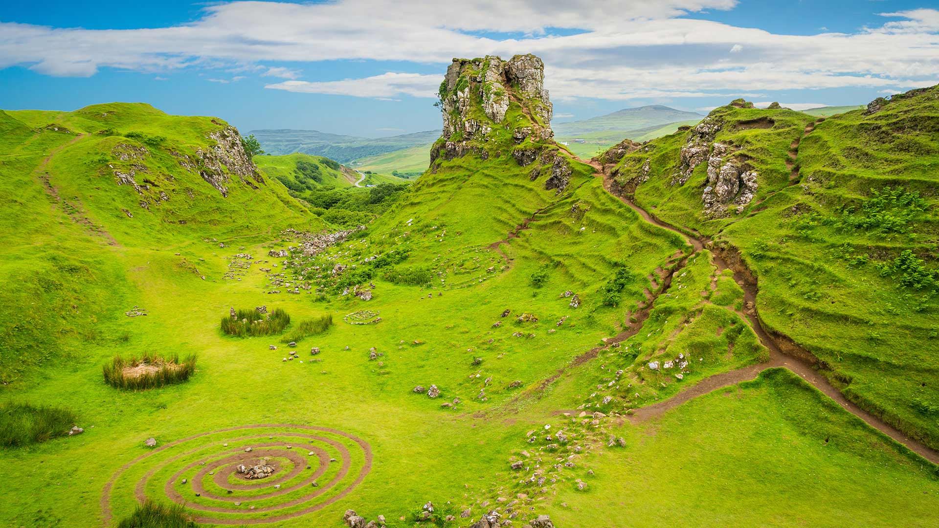 仙女谷位于斯凯岛乌伊格小镇旁边的群山之间,这里的迷人风光如其名字一样美。这里有圆锥形的山丘、孤峰、池塘和嶙峋的树木。这个由一系列小型山体滑坡形成的山谷,仿佛一个世外桃源。仙女谷位于斯凯岛最北端的特罗特尼什半岛上,历史上这里发生过一次延绵近20公里的山体滑坡,从而形成了这里独特的风光,像一个由陡峭的山坡、高原和壮观的岩层构成的魔幻迷宫。