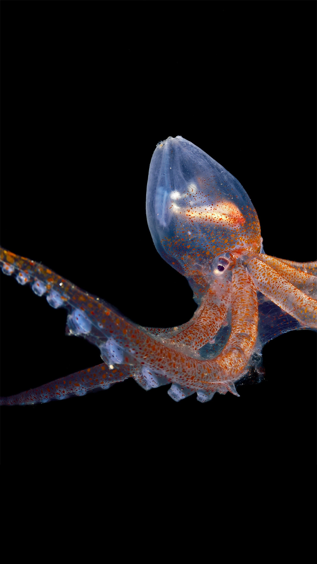 生活在黑暗中的玻璃章鱼几乎是隐形的,这有助于它们躲避像巨齿槌鲸这样的捕食者,只有它们的眼睛不透明,这可能会“出卖”它们。玻璃章鱼相对较小,有一个大约4英寸长的“外套”(容纳器官的球状“头部”)。它们的寿命和大多数章鱼一样,只有短短几年。它们长得快、成熟早,繁殖完毕就很快死去,永远不见天日。