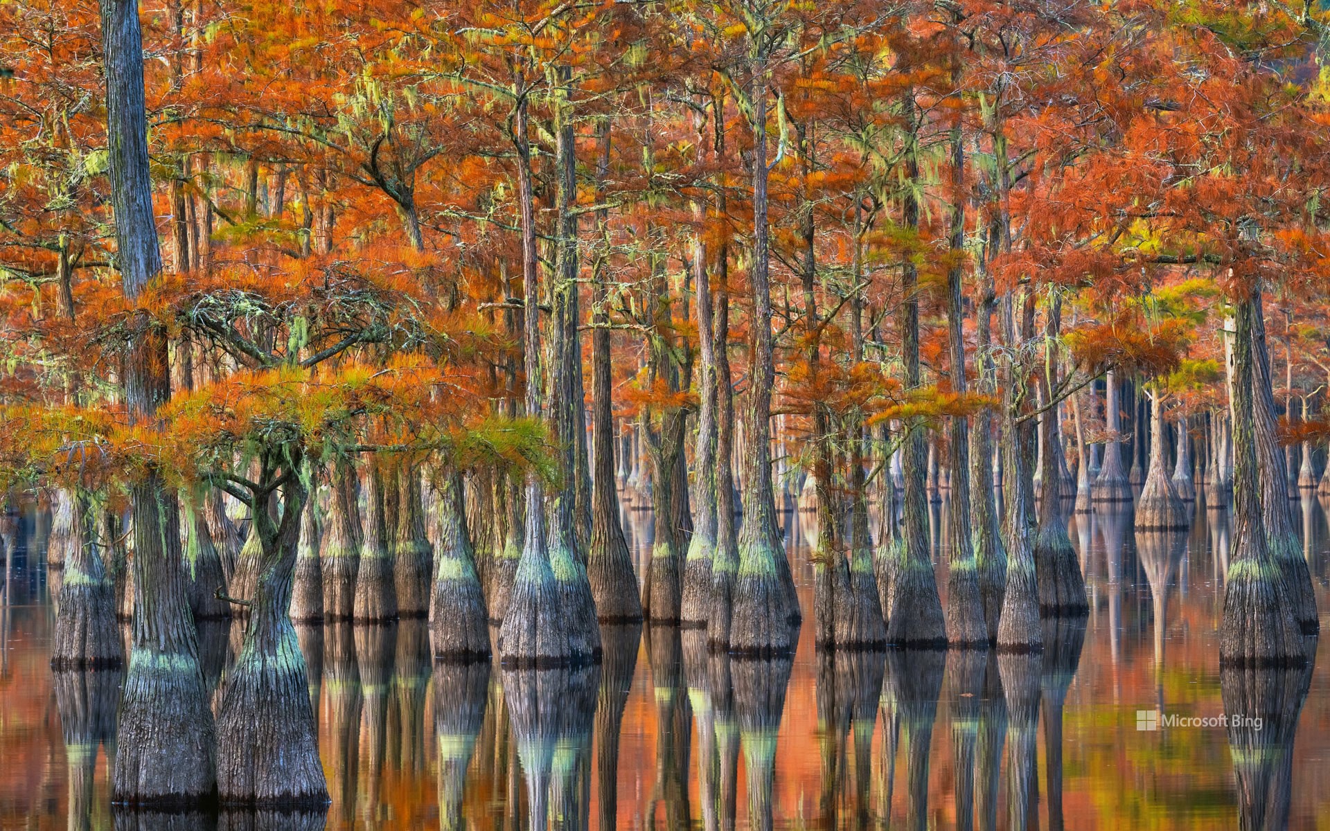 秋天,乔治亚州的落羽杉披上了灿烂的金色、橙色和深红色。大部分柏树的叶子是四季常青的,但落羽杉的树叶却是会掉的。落羽杉的羽毛状叶片在秋天变成红棕色,在冬天落下,然后在春天长出新的针叶。落羽杉原产于美国东南部,在墨西哥湾沿岸的密西西比河流域茂盛生长。它们在路易斯安那州的海湾很常见,也生长在大西洋中部的沿海平原,比如今天照片中这片绚丽的小树林。落羽杉在河岸和沼泽等潮湿环境中茁壮成长。它们生长缓慢,却能长到100英尺以上,为两栖动物、鱼类和鸟类提供了重要的栖息地,并保护海岸线免受侵蚀。如果你在这个季节来到乔治亚州,请在落羽杉落叶前,去欣赏它带来的秋日美景吧。