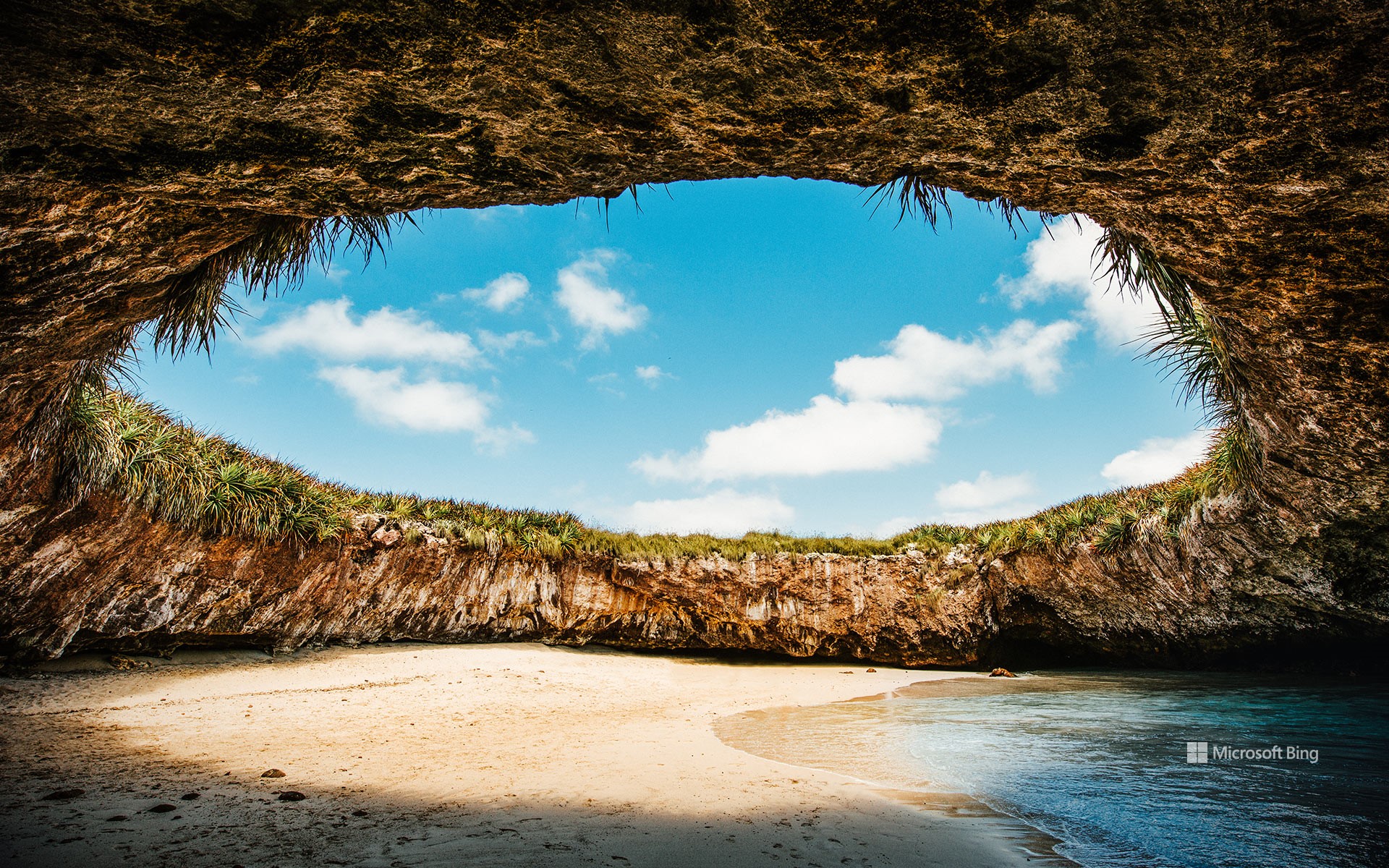 这张绝美的照片是在埃莫海滩拍摄的,这里又被称为“隐秘海滩”,位于墨西哥巴亚尔塔港西北处的偏远海岛,这里以其纯净的美景和独特的地貌而闻名。这处海滩只能通过一个自然侵蚀形成的隧道到达。沙滩和周围的岩壁组成了一个仰望天空的天窗,碧蓝的天空、绿松石色的海水、长满鲜花的崖壁相互映衬,景色独一无二。埃莫海滩又称“爱情海滩”,已经是一个热门的旅游目的地,但是为了保护这里的自然风景和生态环境,当地限制了游客数量。