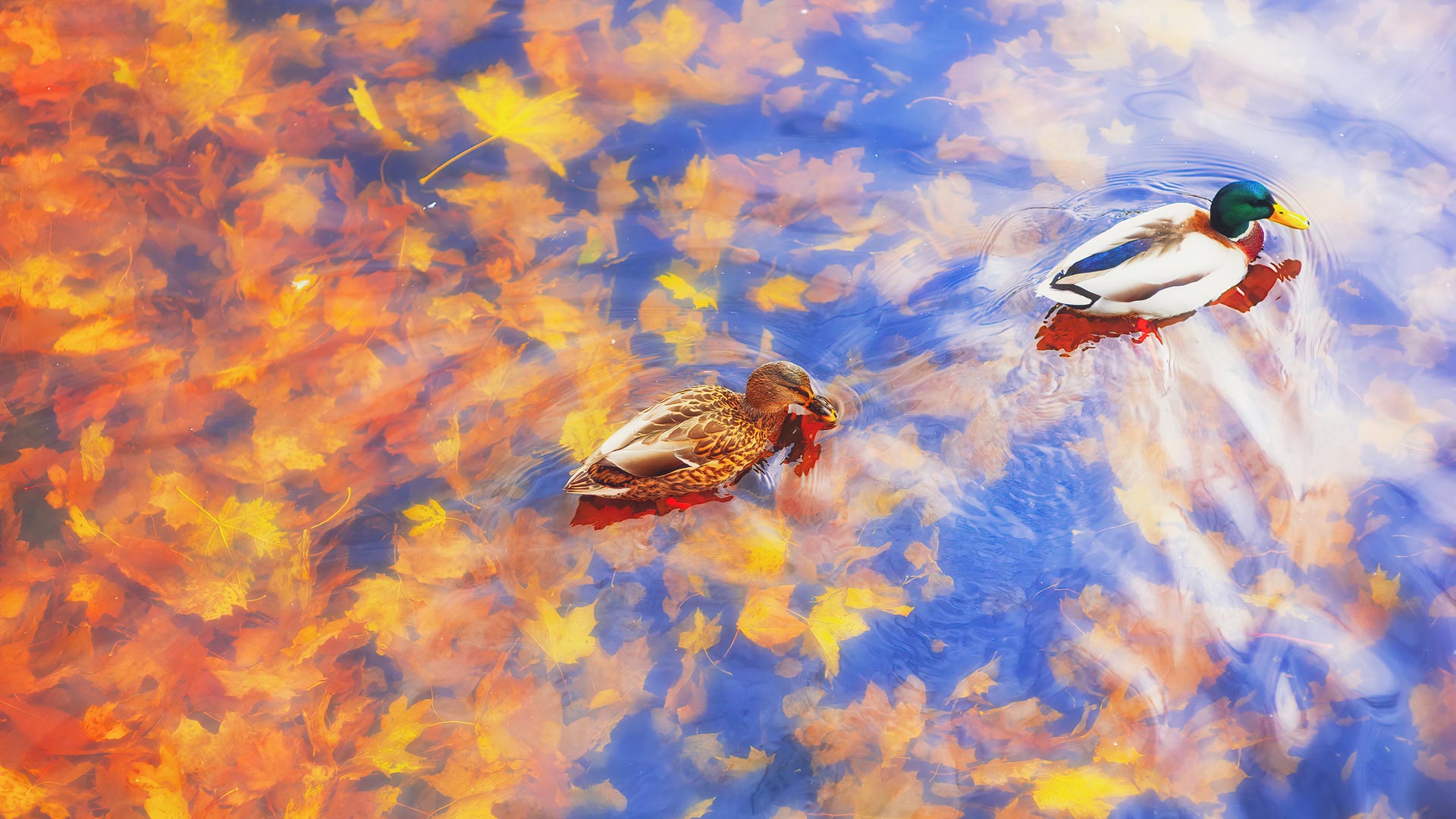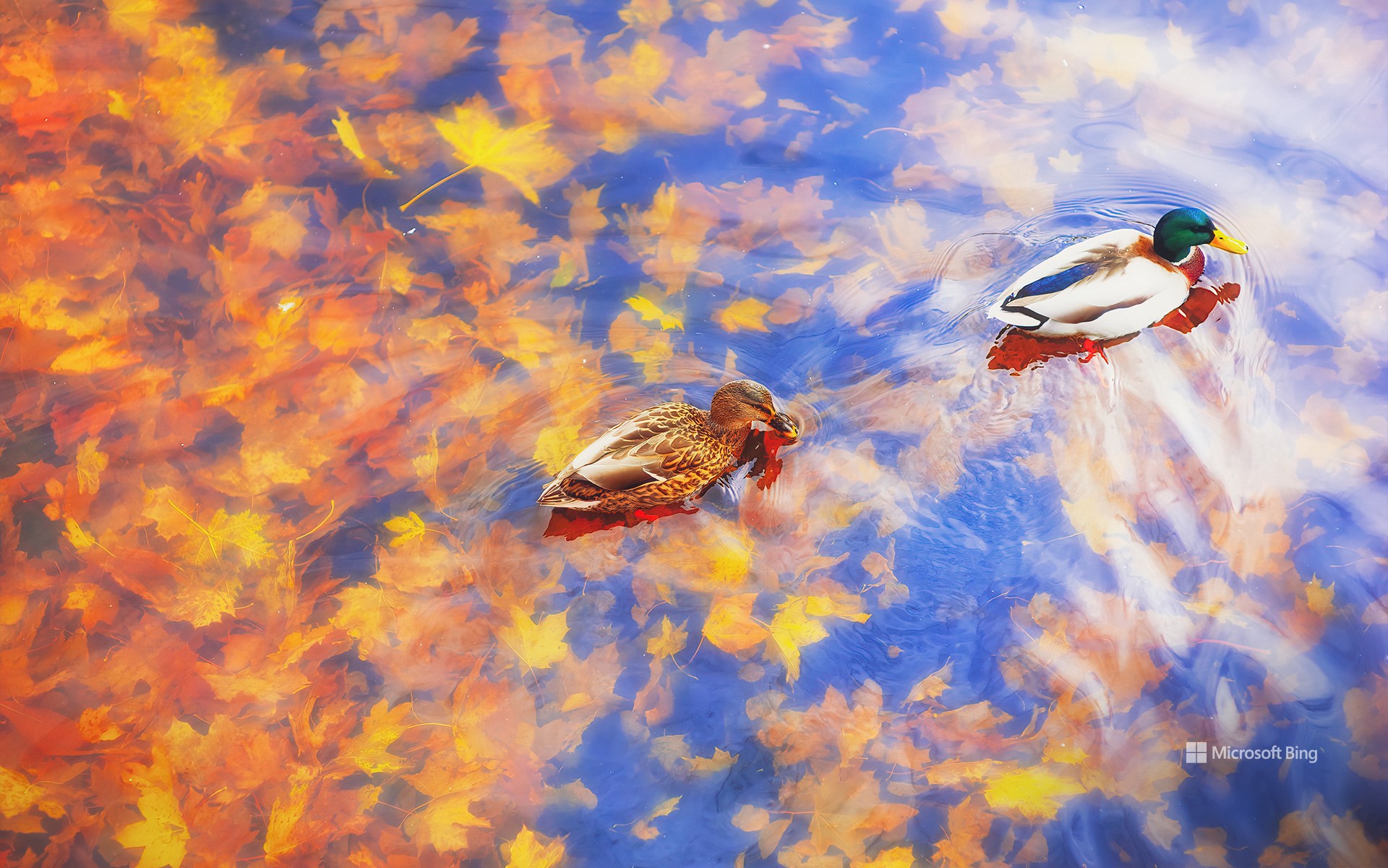 两只绿头鸭在水里畅游,秋天,德国