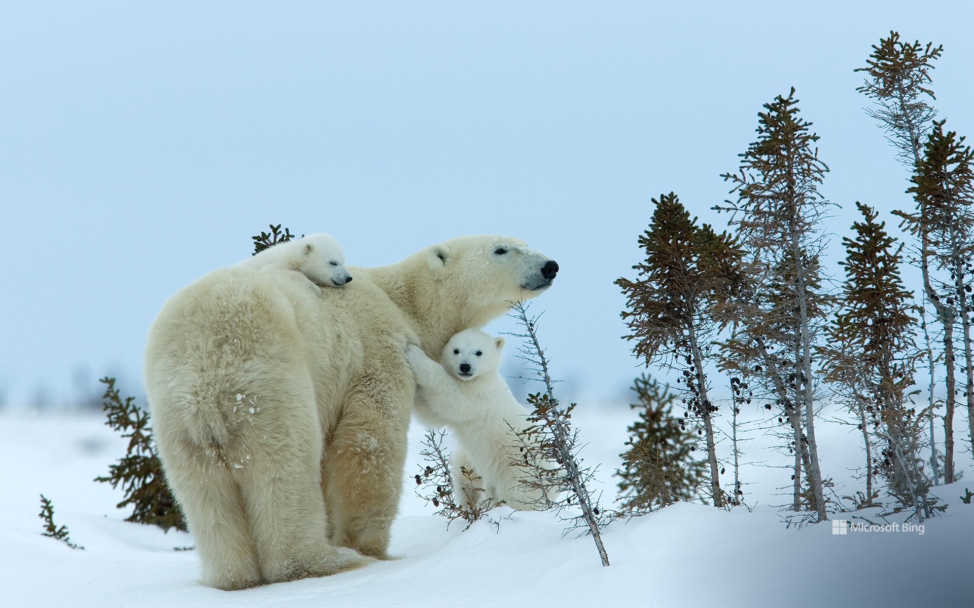 北极熊妈妈和幼崽,丘吉尔城,曼尼托巴省,加拿大 (© Thorsten Milse/Getty Images)