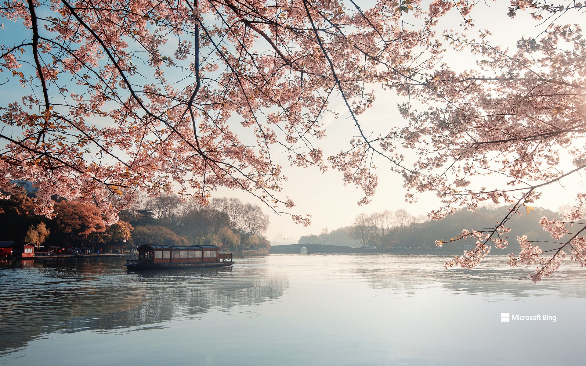 许多花卉都在春分之后慢慢绽放,例如樱花就是春季具有代表性的花卉之一。中国古时已确有多种樱花。秦汉时期,樱花栽培就已应用于宫苑之中,距今已有2000多年的历史。唐朝时,已普遍栽种在私家庭院中。在园林美化造景中,樱花可群植形成“花海”景观,或列植为行道树,或列植种在湖畔旁。今日图片中为您带来的是杭州春季盛开的樱花和湖面的游船,这正式一处欣赏春日园林水景的绝佳之处。