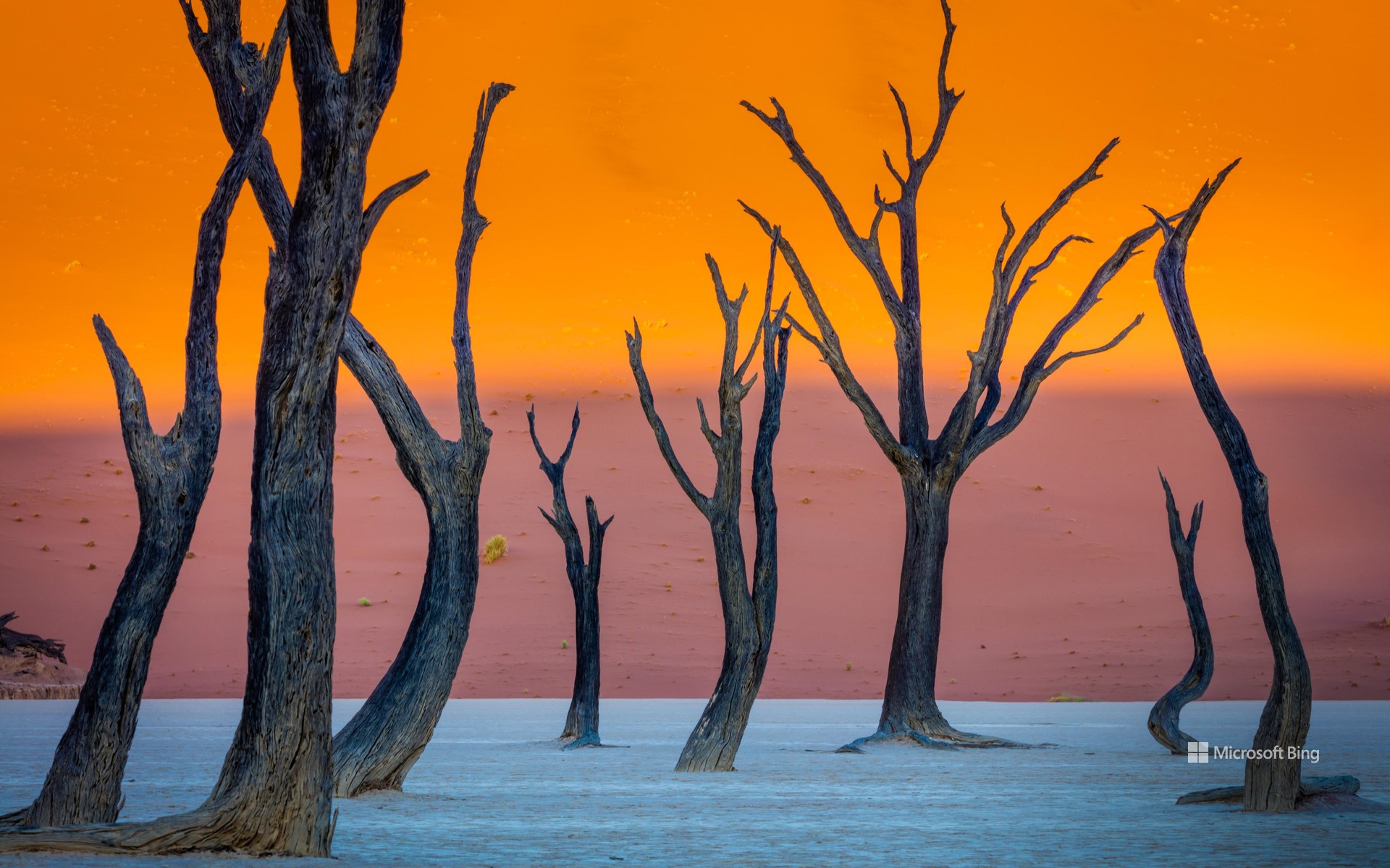 乍一看,这仿佛是一件超现实的艺术装置:黑暗的树木凝固在黏土平原上,背后是沙丘和闪烁的天空。但这幅来自纳米比亚纳米布-诺克卢夫国家公园的德阿夫莱(Deadvlei)的景象,完全是自然形成的。德阿夫莱(Deadvlei)这个名字意为“死沼泽”——这是曾经填满这个盆地的湿地的遗迹。