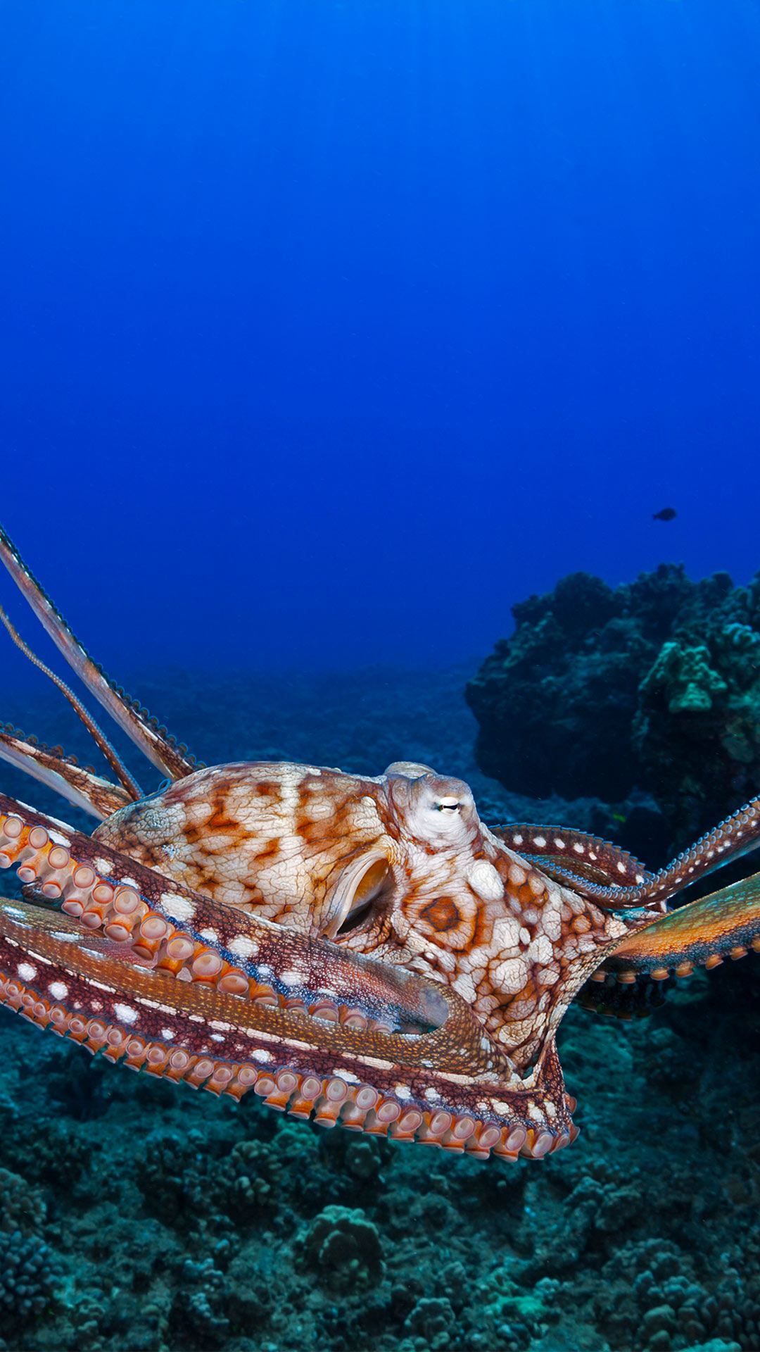 来认识一下伪装大师——白日章鱼。这种栖息于珊瑚礁的生物遍布太平洋和印度洋,从夏威夷到非洲东海岸皆有踪迹,堪称真正的“变形高手”。与大多数同类不同,它在白天狩猎,能瞬间改变体色、花纹乃至皮肤质地,完美融入环境。有时它还会上演精妙的"浮云幻影"戏码,投射虚假阴影诱使螃蟹在致命时刻移动。一旦猎物上钩,它便迅速出击。这位高超的猎手在珊瑚礁间游走,捕食鱼类、螃蟹、虾和软体动物。小猎物当场吞食,大猎物则拖回巢穴慢慢享用。