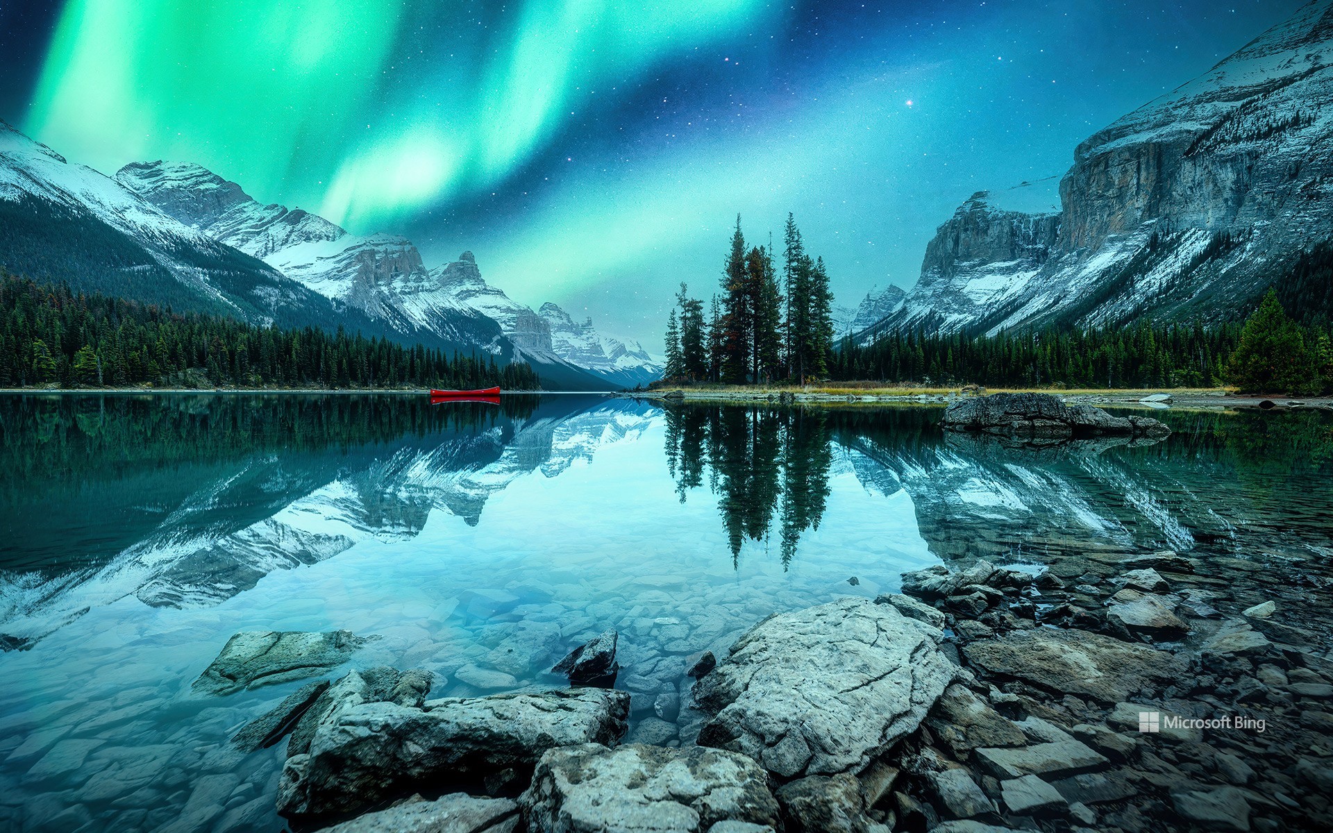 Aurora borealis over Maligne Lake in Jasper National Park, Alberta, Canada (© Mumemories/Getty Images)
