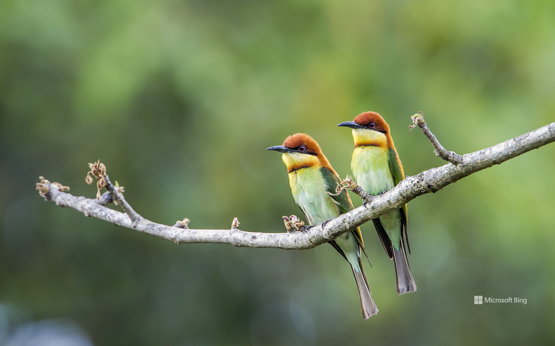 It's not just a name. Chestnut-headed bee-eaters really do spend their days swooping after stinging insects. As well as bees, they also feast on wasps, hornets and other bugs. The birds in today's image are in Bardia National Park in Nepal, but they're found across many other South Asian countries, from India and Bangladesh to Sri Lanka and Thailand. They catch their prey mid-flight, returning to a perch where they can beat stinging insects to stun them, which makes them safe to eat. These birds are designed to hunt: their dazzling green plumage helps camouflage them in dappled jungle light, their curved beak is perfect for picking off insects with precision and their eyes can move individually, which makes them all the better for spotting bees.