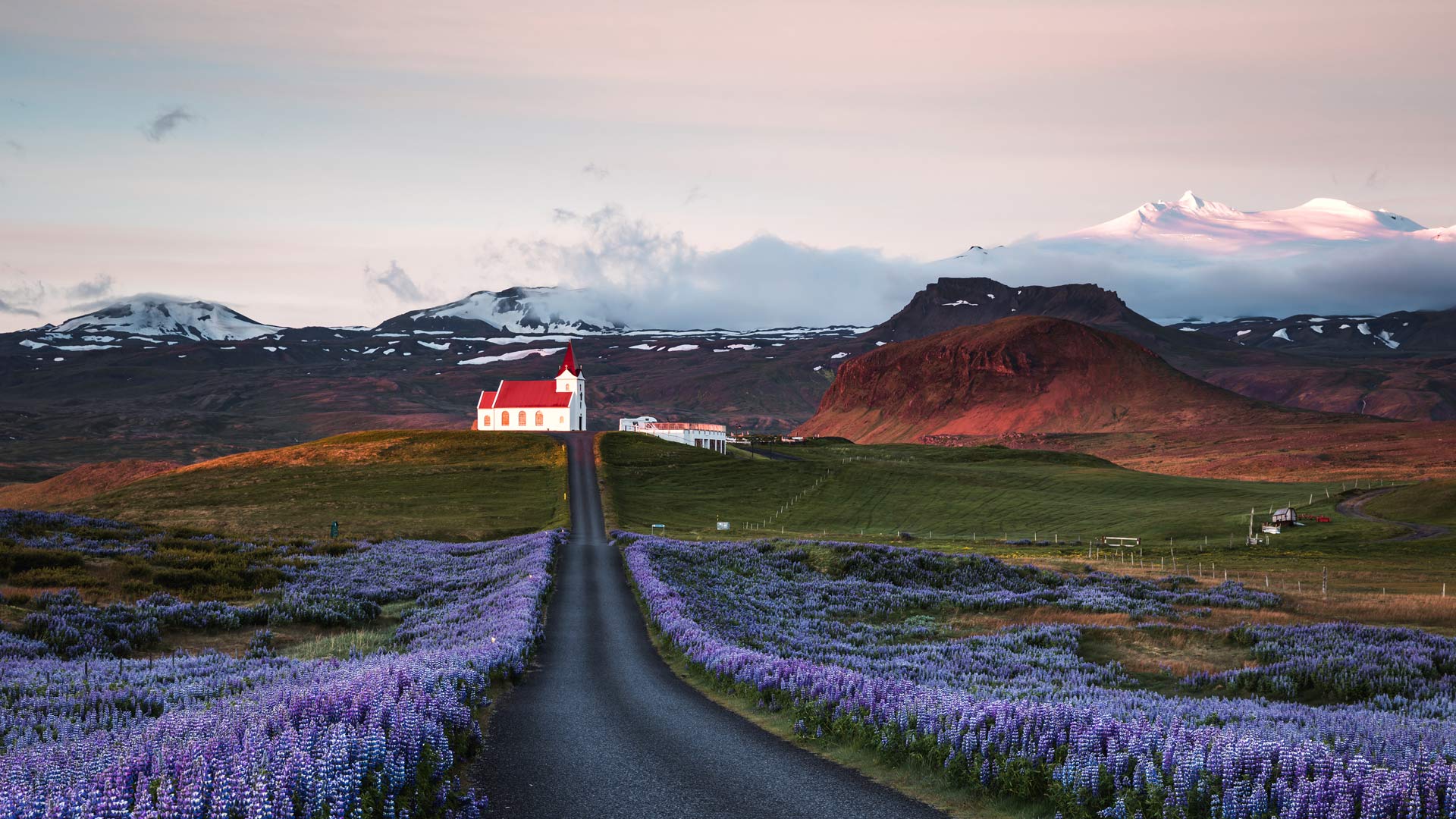 Lupine fields and church at sunrise, Snæfellsnes Peninsula, Iceland (© Matteo Colombo/Getty Images)