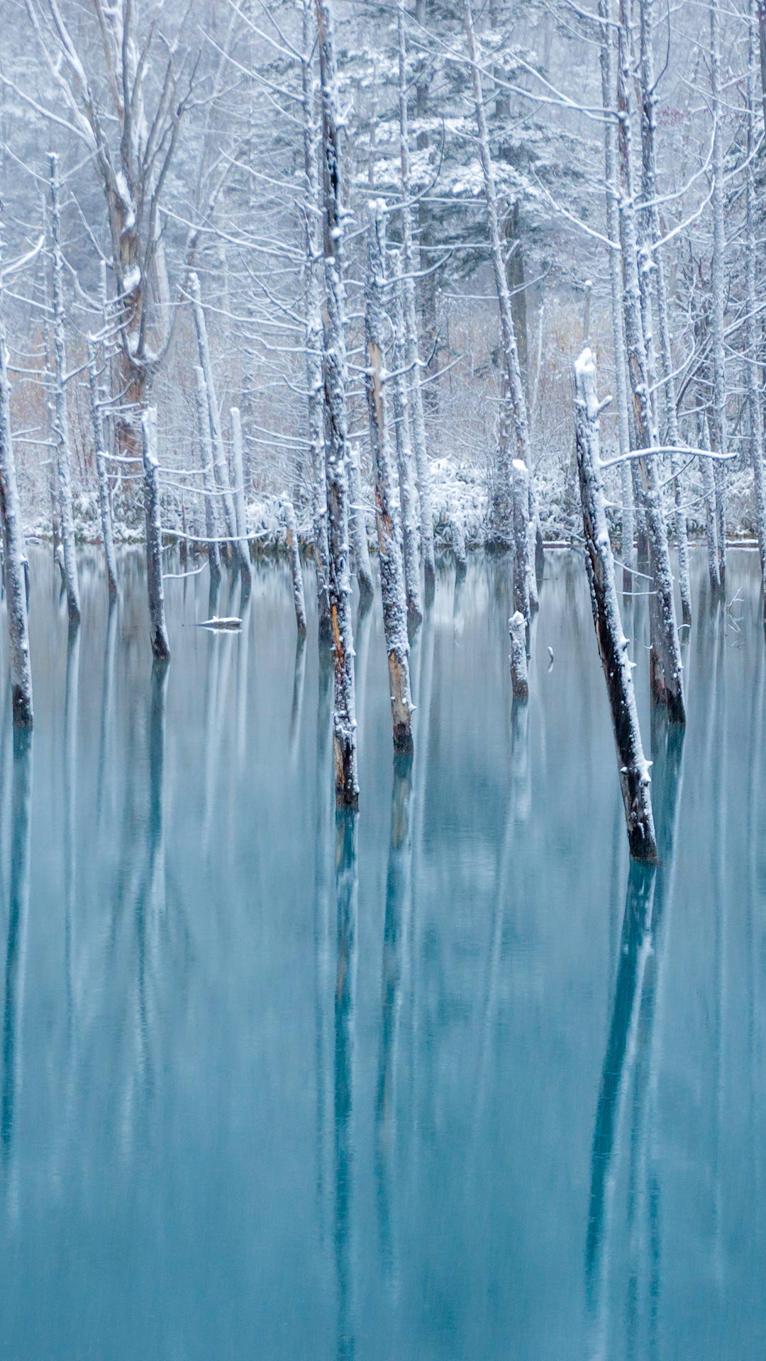 今日 12 月 22 日は冬至です。北半球では正午の太陽の高さが一年中で最も低くなる日で、昼が最も短く、夜が最も長くなります。季節の変わり目であり、寒さが一層厳しくなる時期でもあります。ここ、北海道美瑛町の「青い池」には、静かに雪が降り積もっています…