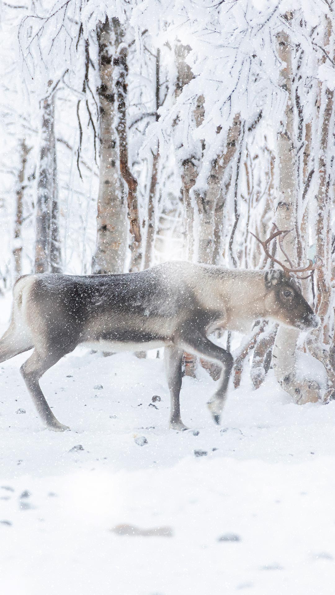 Rena em uma nevasca de inverno, Lapônia, Finlândia