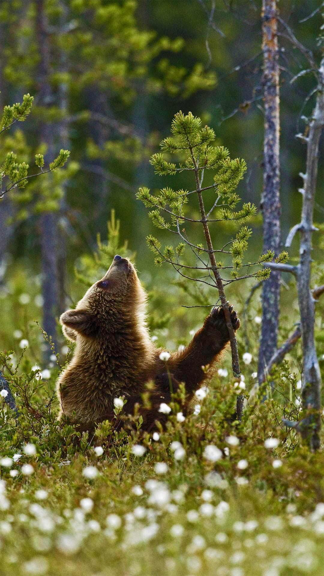 北方针叶林中的欧洲棕熊幼崽,芬兰 (© Jules Cox/Minden Pictures)