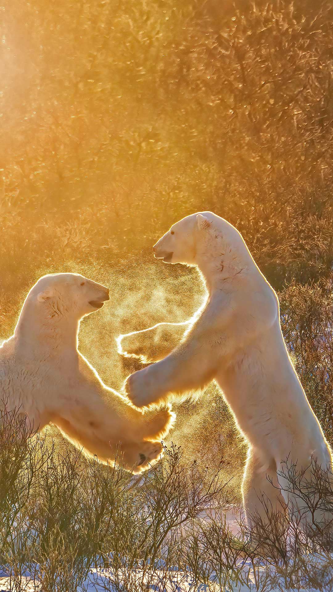 两只玩耍的北极熊,加拿大丘吉尔镇 (© Cheryl Ramalho/Getty Images)
