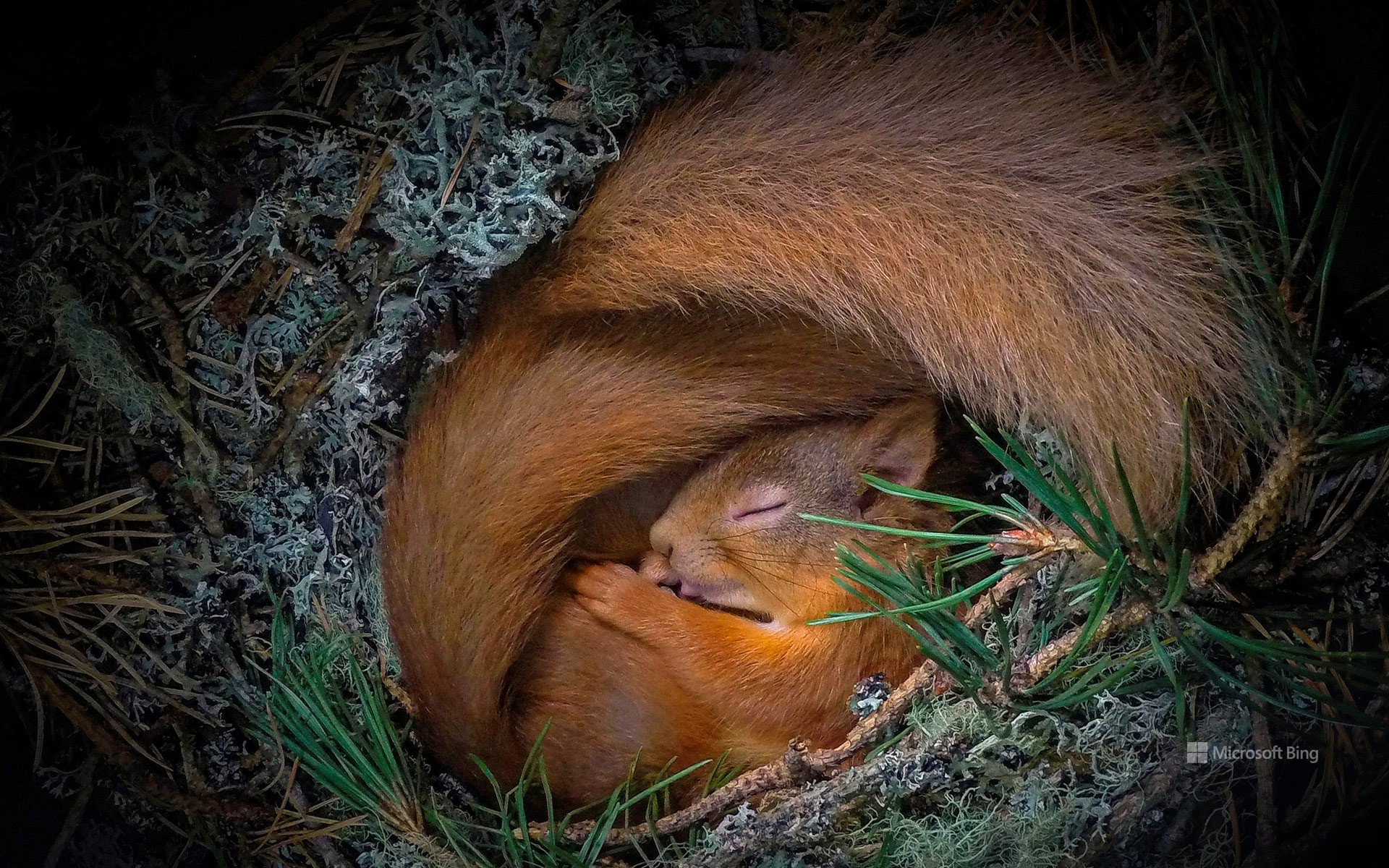 小窝中安睡的欧亚红松鼠,苏格兰高地 (© Neil Anderson/Minden Pictures)