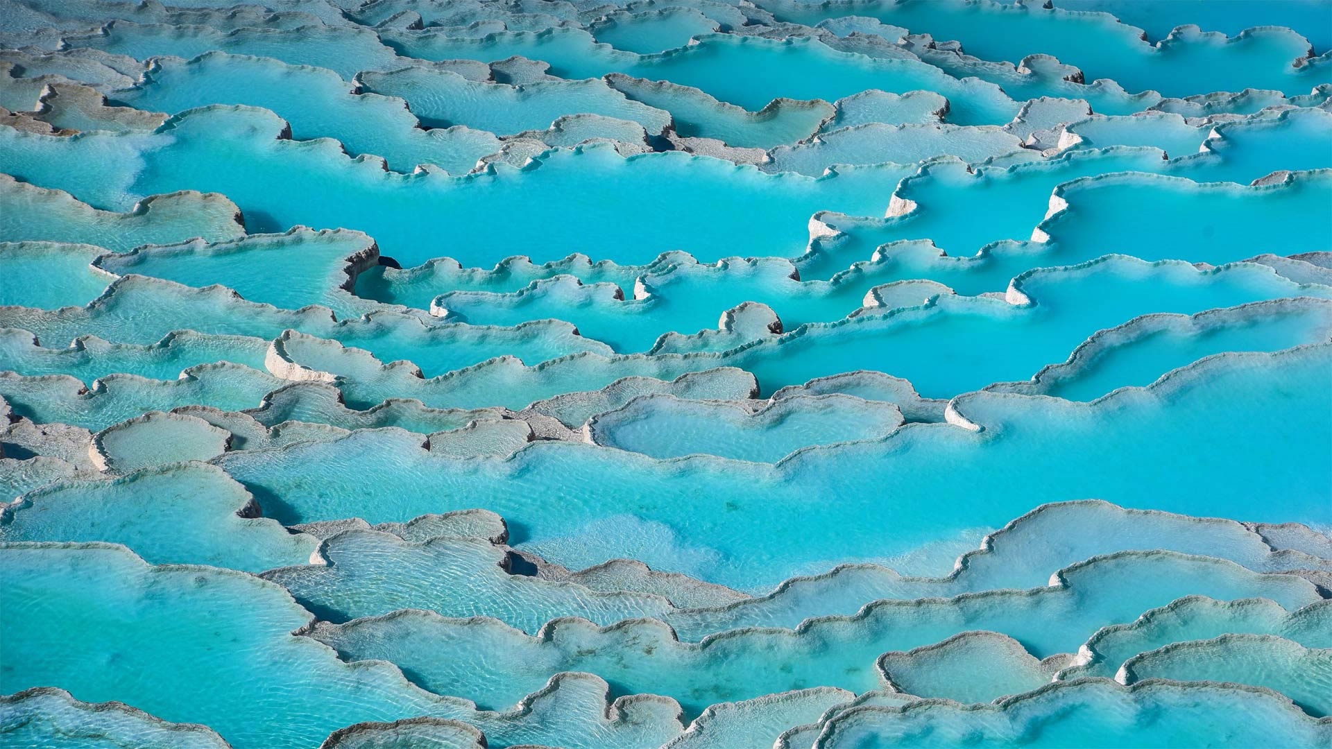 棉花堡也被称为“棉花宫”,是为了向覆盖在山坡上的蓬松的白色岩层致敬。这种“棉花”就是石灰华,一种柔软的石灰石,是由几个世纪以来从悬崖上的泉水中滴下来的方解石沉积形成的。这是一种令人惊叹的白色,但石灰华也有很多不同的颜色,从灰色到金色都有。