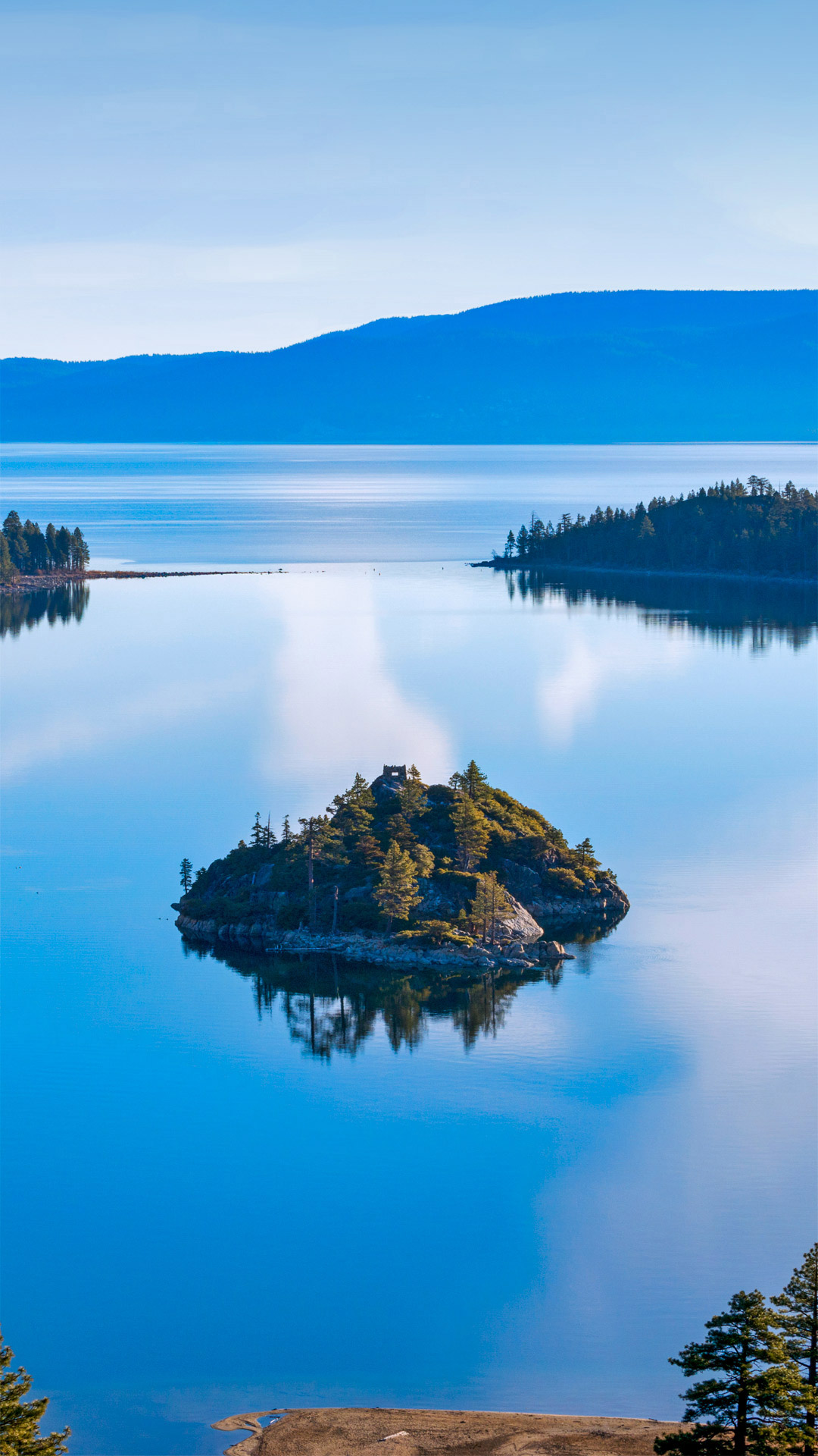 在一个巨大的高山湖泊里有一个花岗岩小岛,叫芬尼特岛,它是太浩湖里唯一的岛屿。这个巨大的湖泊位于内华达山脉,海拔6225英尺,横跨在加州西部和内华达州东部的州际线上,几乎完美对称。芬尼特岛位于太浩湖西南海岸加利福尼亚一侧的翡翠湾。在这张图片的顶部可以看到一个狭窄的入口,它连接了翡翠湾与湖的其他部分,其自然美景一年四季都吸引着游客。