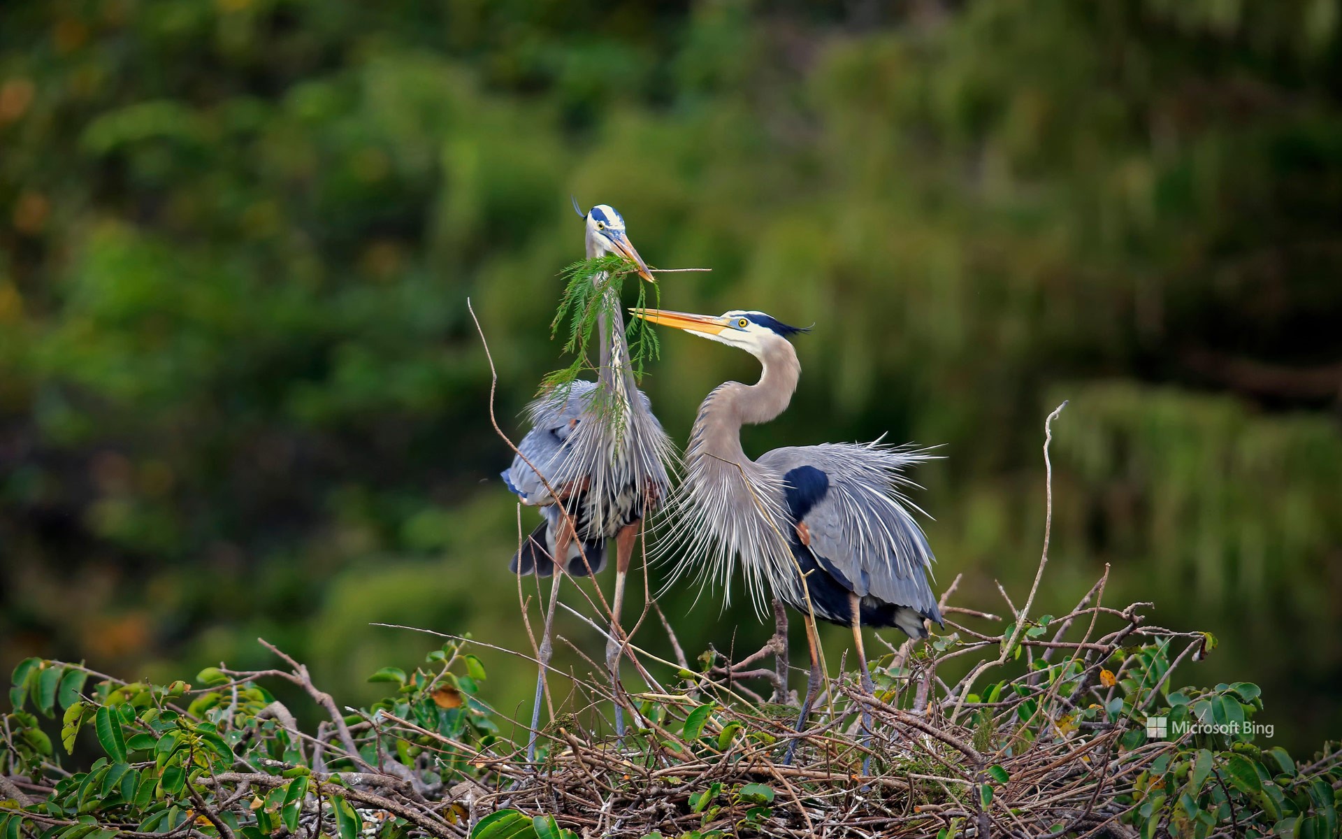 大蓝鹭是北美最大的苍鹭。它们喜欢用树枝在树的高处筑巢,巢里放上苔藓、树叶、草和其他柔软的材料。每年大蓝鹭都会回到同一个筑巢地,雄鹭负责寻找材料,雌鹭则负责筑巢,然后夫妻俩共同维护“爱巢”。照片里的这只雄鹭正把嘴里的筑巢材料交给它的配偶,可以说非常符合今天的主题了。
